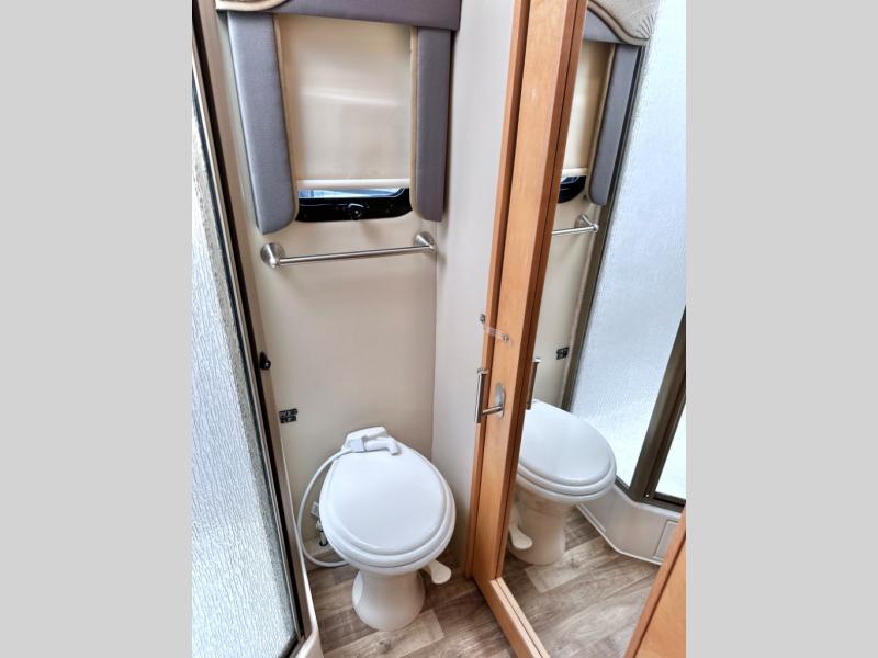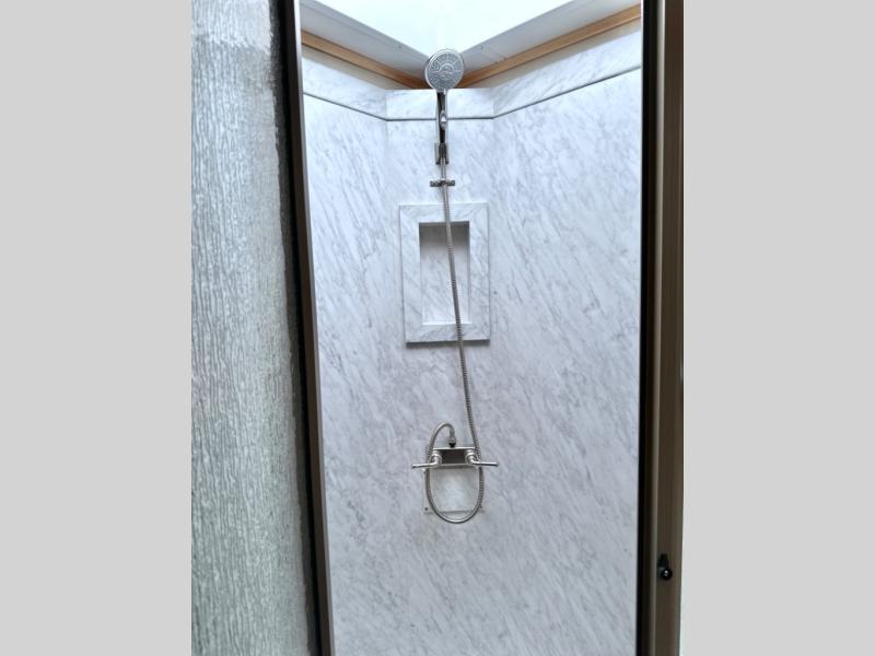 Back to the very rear of this Vienna coach you will find a convenient bathroom including a sliding pocket door. Here enjoy an angled shower for keeping clean, plus a toilet and vanity with sink. There is also a large space for your clothing storage, plus so much more!