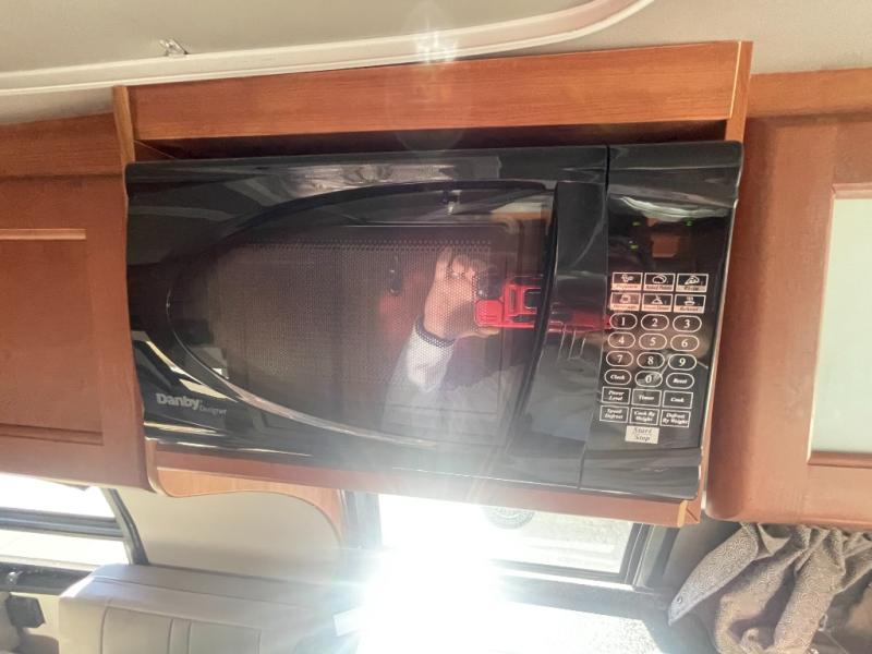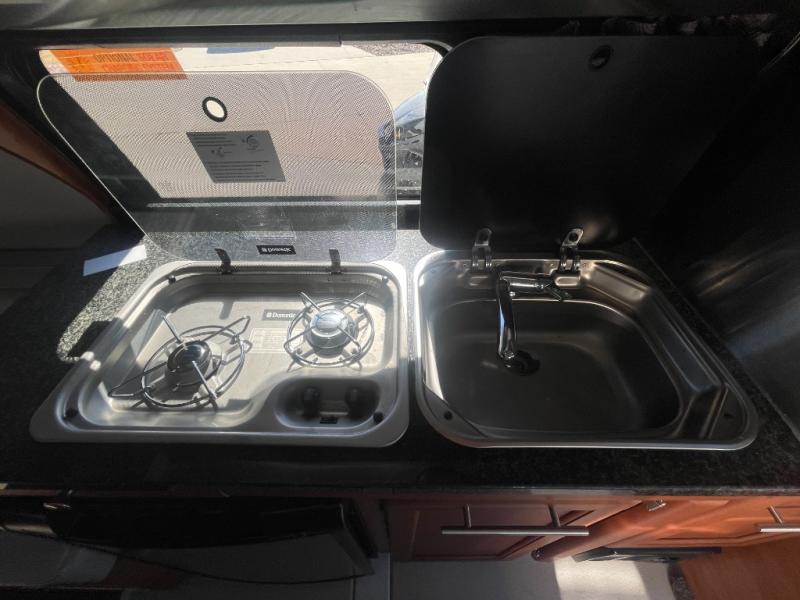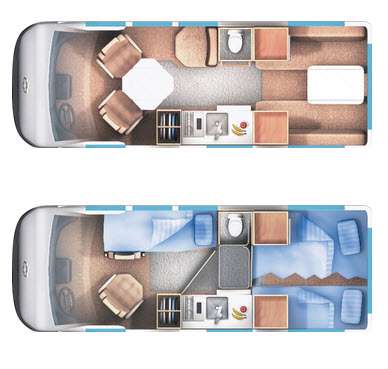 During the day, you will find a front dinette with three swivel captain's chairs. As you continue down the passenger side of the van, there is a toilet. The rear sofa dinette also includes two bench seats. Continuing around the motorhome there is a refrigerator, microwave, single bowl sink, stove top, wardrobe, and more!