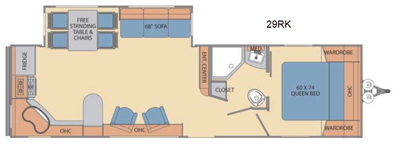 As you enter this Shasta Revere model 29RK notice that it features a rear kitchen layout, as well as featuring a complete bath conveniently located almost directly across from the entry door.