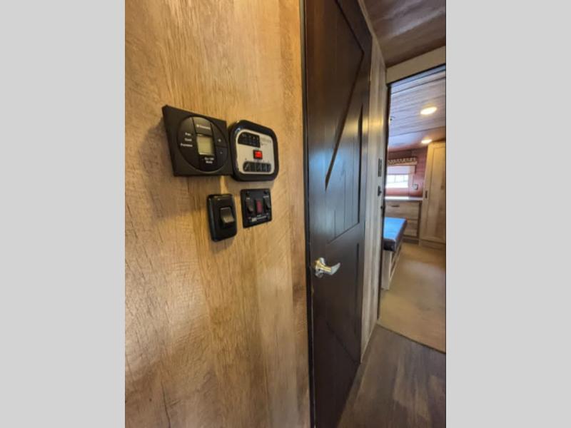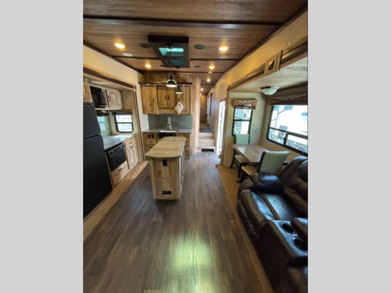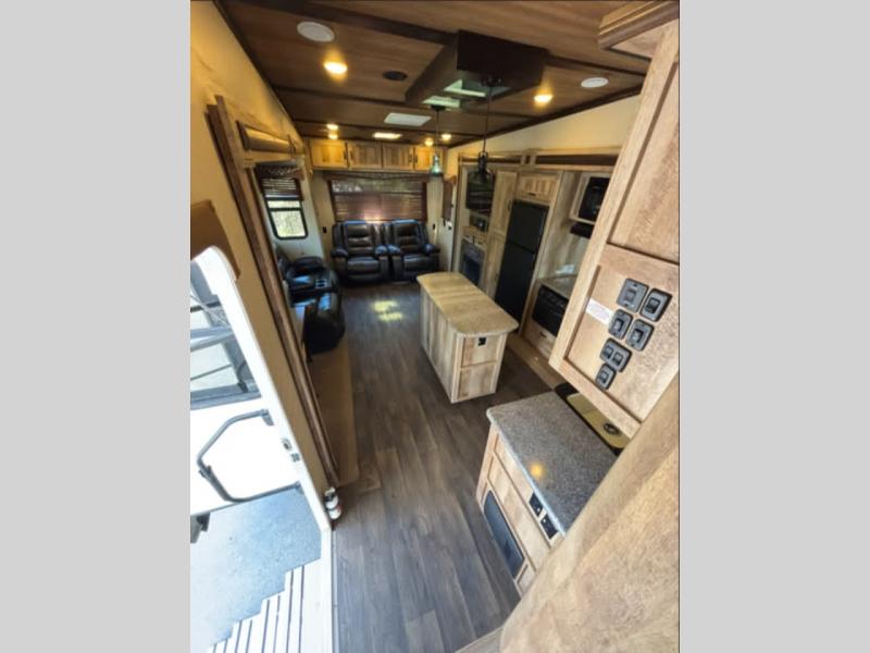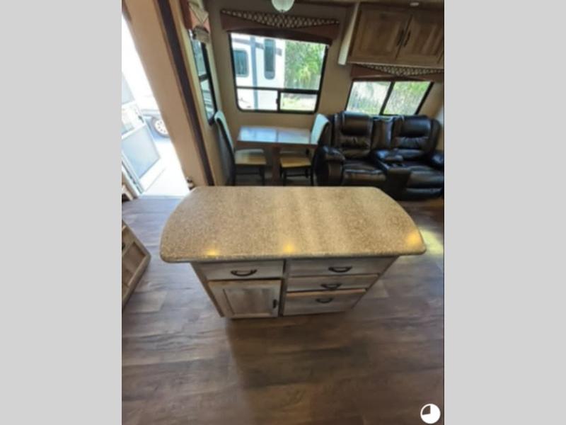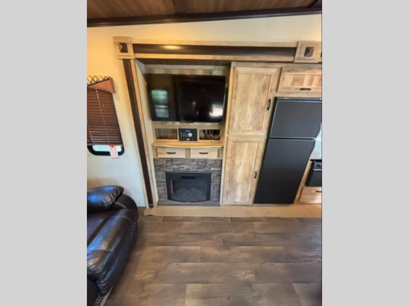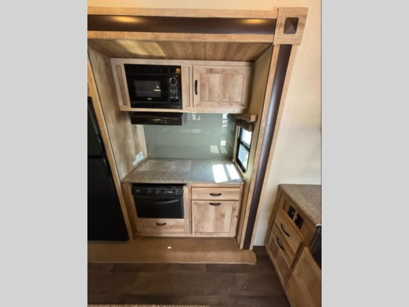 Opposite the door side find a full functioning kitchen slide that also includes the entertainment center with a 40" LED TV and fireplace beneath. The kitchen area includes everything needed to whip up meals and snacks while you are away. There is a three burner range, a microwave oven, and 9 cu. ft. refrigerator for all of your perishables. You can choose a 12 cu. ft. option if you like, plus there is plenty of storage space for your food items and daily dishes in the upper and lower cabinets as well. Along the interior wall just off the slide a farm style sink and more overhead space for storing your things. The center island is also quite handy for food prep and additional storage.