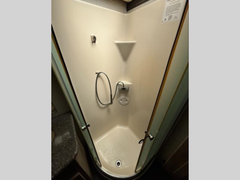 Head up the steps to the right of the entrance and find a front bedroom and side aisle bath. The bath offers a corner shower, toilet, sink and small linen cabinet near the door. A second linen cabinet is accessible with the large bedroom slide fully expanded. There is a convenient second entry door that leads into the master, or you can use the main hall sliding door.
