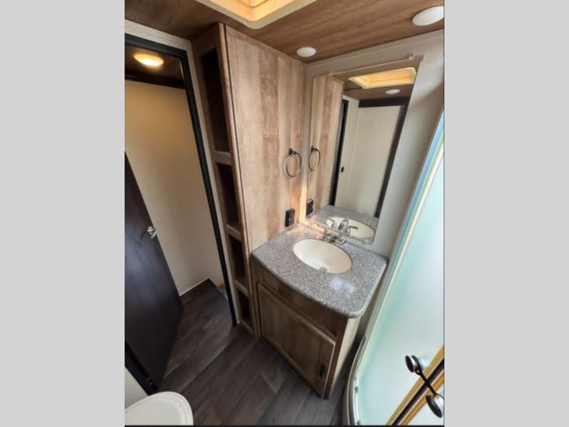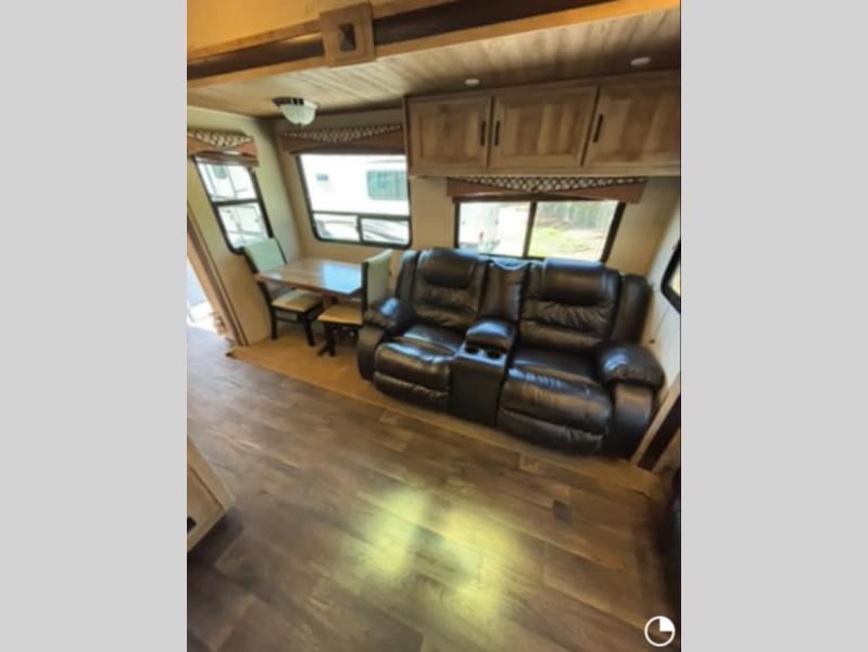 Step inside and notice how open and inviting the space is with dual opposing slides in the rear combined living room and kitchen. There is a free standing dinette and theater seat in the slide along the curb side to the left of the door. Along the rear wall a sofa, or optional tri-fold if you need added sleeping space at night.