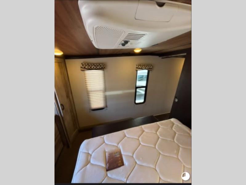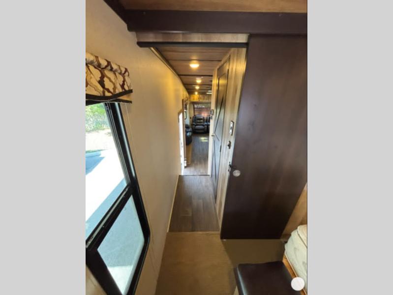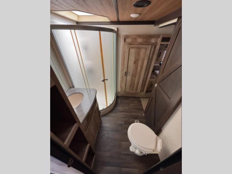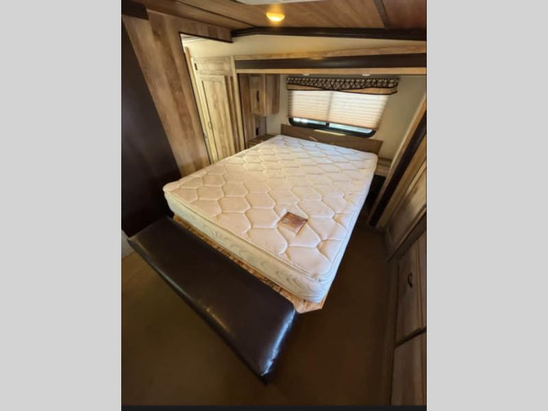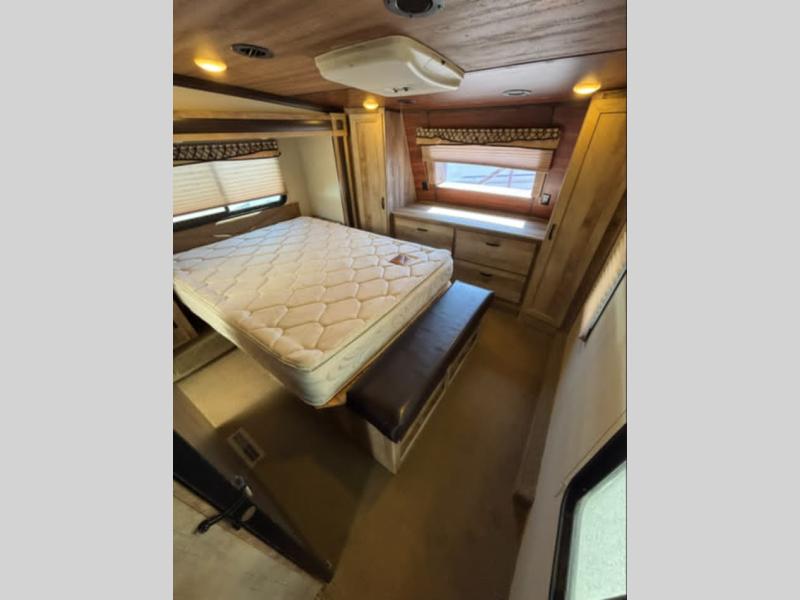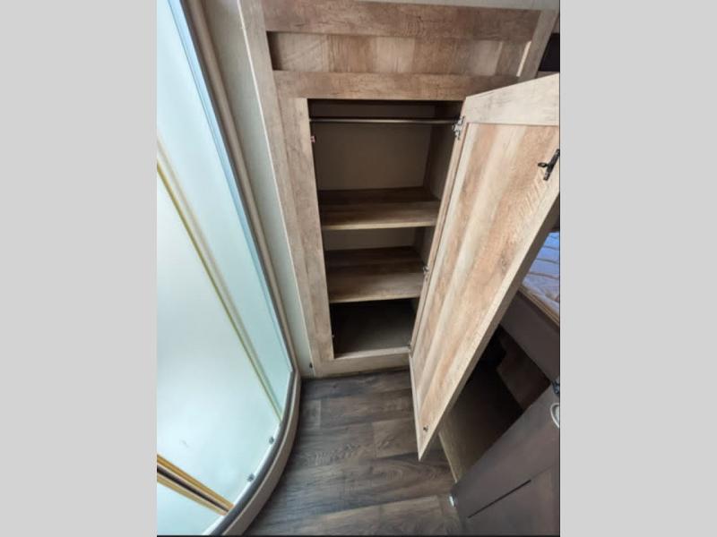 The master bedroom features a relaxing space with plenty of room thanks to the large slide. Here enjoy a queen bed for comfort, including a bench off the foot of the bed. The front wall features a dresser with dual shirt closets on either side, plus a nice window in the front cap above the dresser area for adding natural light. You can also add an optional 32" TV in this space if you choose, plus so much more!