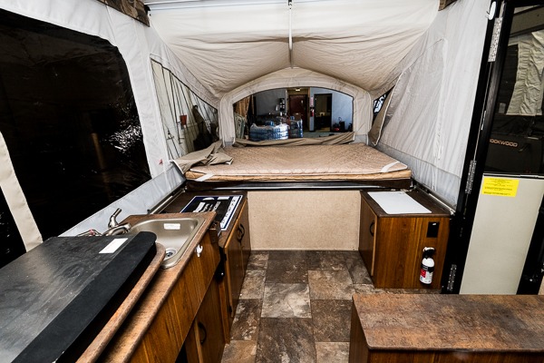 Blow out price.... Handyman Special - Area of soft floor.As you step inside model 1020 you will notice the storage cabinets throughout. There is one to your immediate left and right, and then two larger ones on either side of the kitchen sink and two burner cook-top.