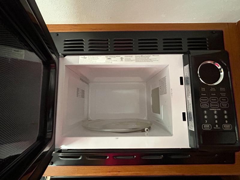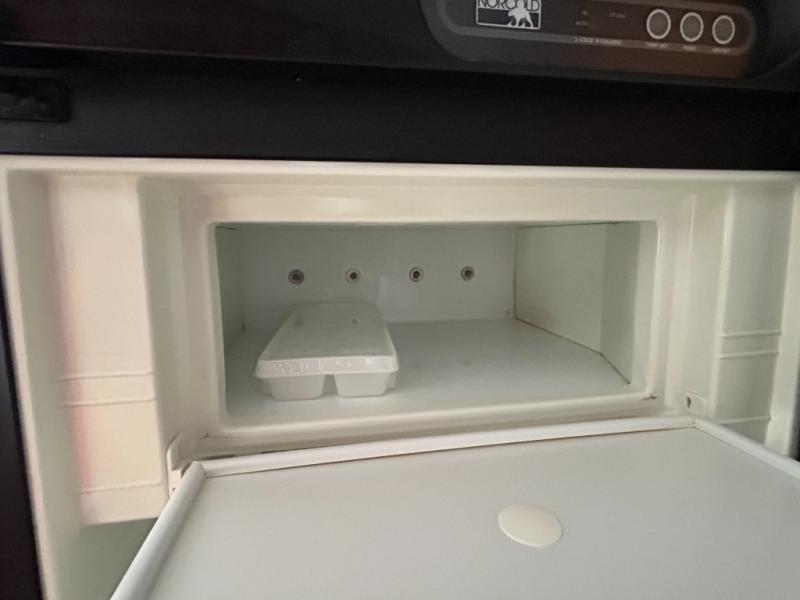 To the left of the entry door you will find a two burner stove-top with microwave oven, single sink and counter space with overhead cabinet for storing dishes and things. Opposite you will find a refrigerator.