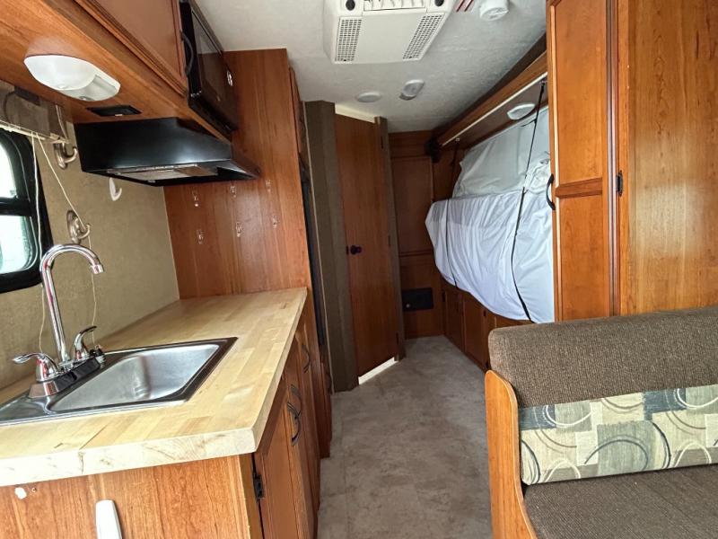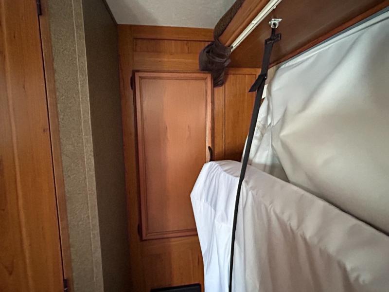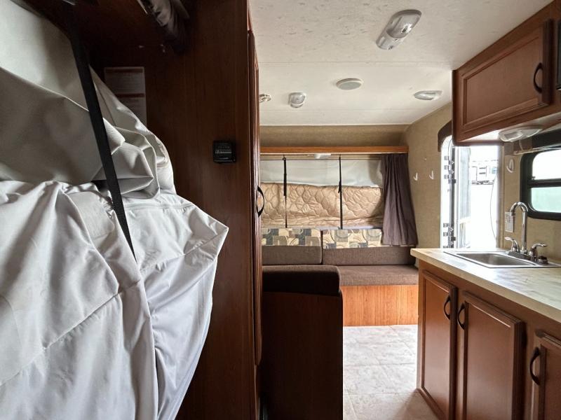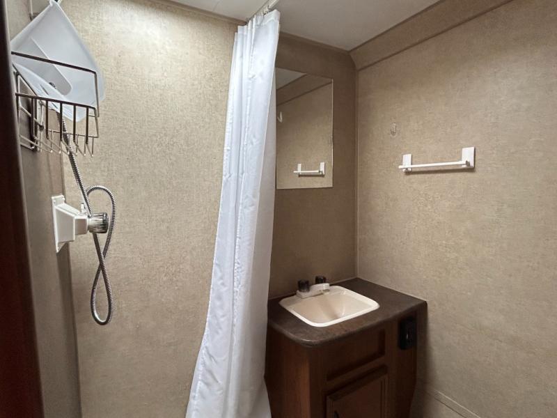 As you step inside you will see a full bed up front with overhead cabinet for storage. Next to the bed is a convenient bath featuring a tub/shower, toilet, and linen cabinet.