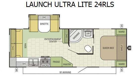 Cook all of your favorite meals and snacks in this Launch Ultra Lite kitchen featuring a pantry for dry goods, a refrigerator, a three burner range with microwave oven, and double kitchen sink for easy cleanup. The dinette is located across the room in a slide out with overhead storage.