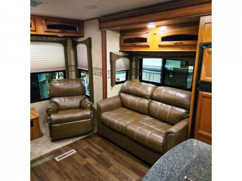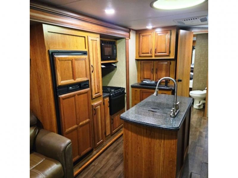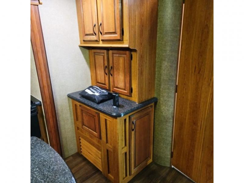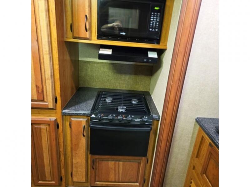 Along the rear wall enjoy two lounge chairs with an end table between and overhead storage above. Adjacent there is more seating with the sleeper sofa or optional hide-a-bed, the choice is yours. Along with the sofa in this slide you will also find some kitchen appliances like a refrigerator, pantry, and a three burner range with overhead microwave oven. You also will find additional storage in the hutch just off the slide out. The kitchen island is also quite convenient and features a double sink making food prep and cleanup simple.