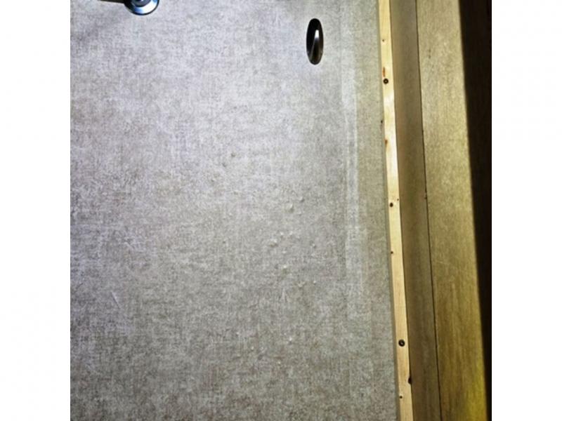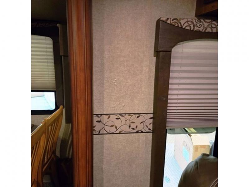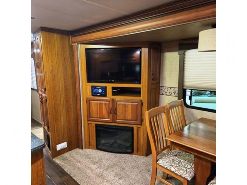 Back in the main living space to the left of the entry door enjoy the wide open space thanks to dual opposing slide outs. Just beyond the pantry cupboard immediately inside the door on the left is the first slide out that features an entertainment center and booth dinette.