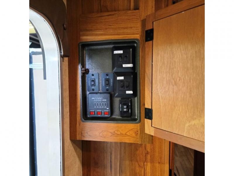 Inside the master enjoy a spacious retreat with a slide out queen bed for sleeping, a full front wall wardrobe for clothing storage and more, plus a dresser with overhead TV cabinet opposite the bed.