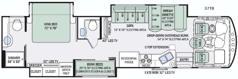 Back at the front of the coach, there is a coffee table between the captain's chairs. You may also choose to use the drop-down overhead bunk for more sleeping space. There is also exterior 32" LED TV mounted just outside the entry door for your outdoor entertainment.
