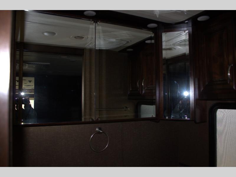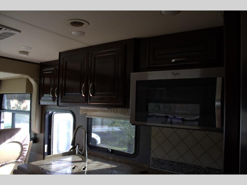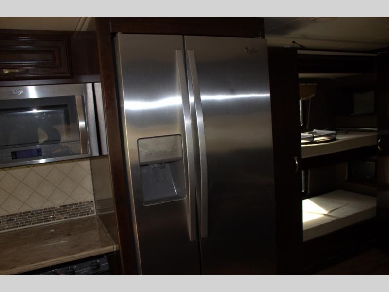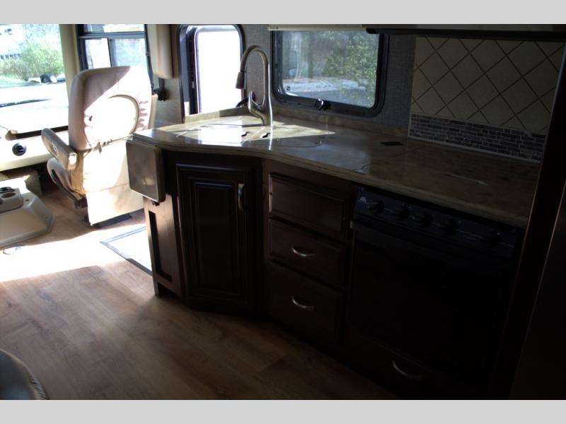 As you enter behind the passenger's seat, you will find the kitchen to your left. It includes an angled double sink, a countertop extension, overhead cabinets, three burner range with overhead microwave, and residential refrigerator.