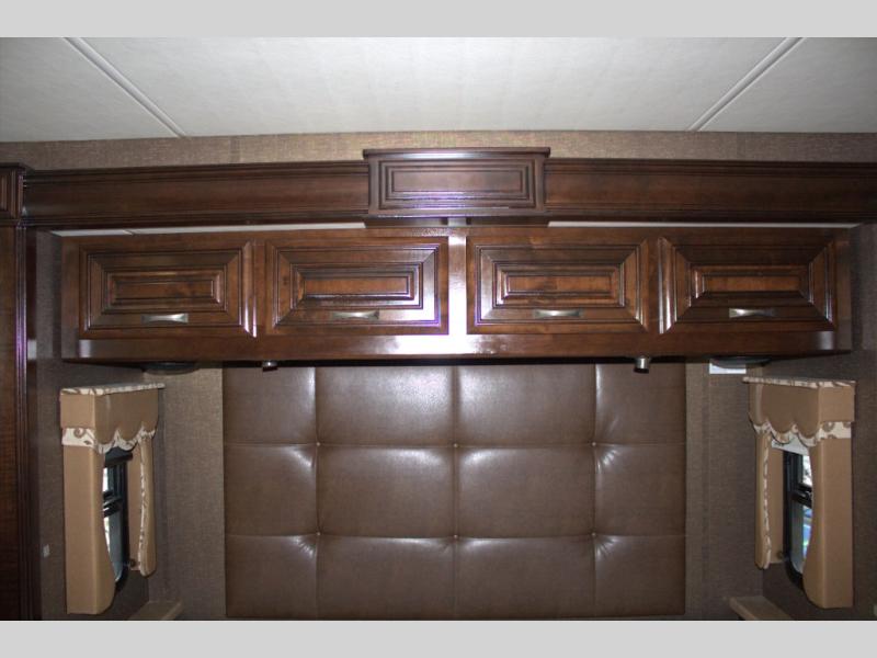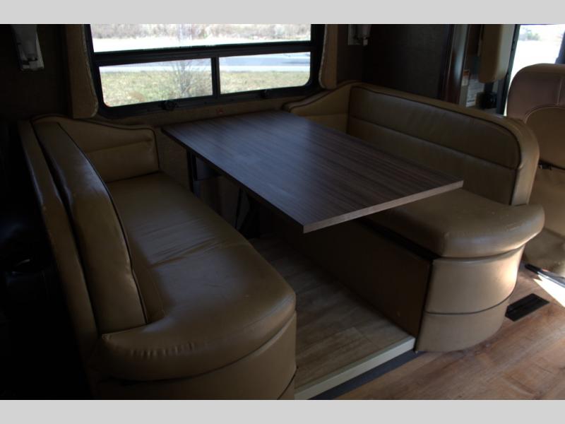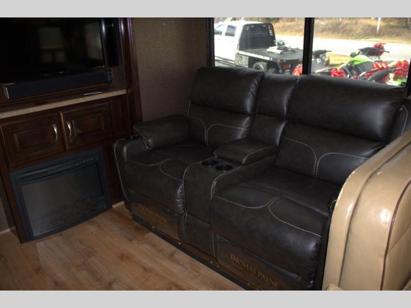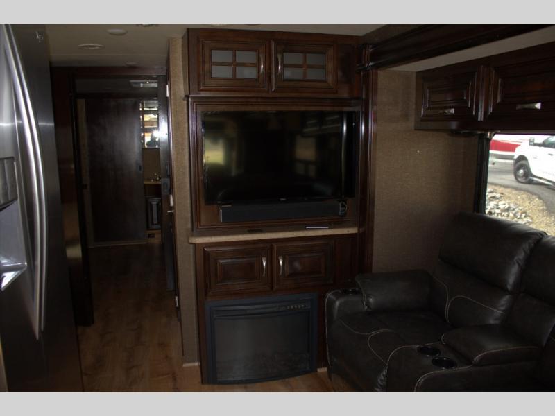 The opposite wall includes a slide out with a dream dinette booth, and a sofa with 51" x 59" sleeping area as well as overhead storage. An interior wall has a 40" LED TV above an electric fireplace with remote.