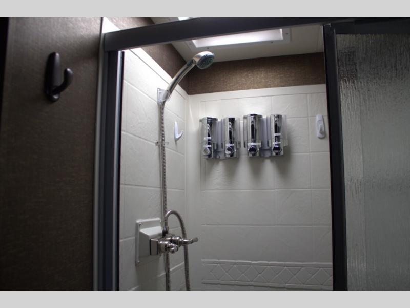 The rear full bath includes a 36" by 30" shower, a toilet, a large vanity with sink, and overhead storage.