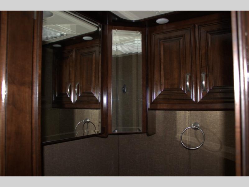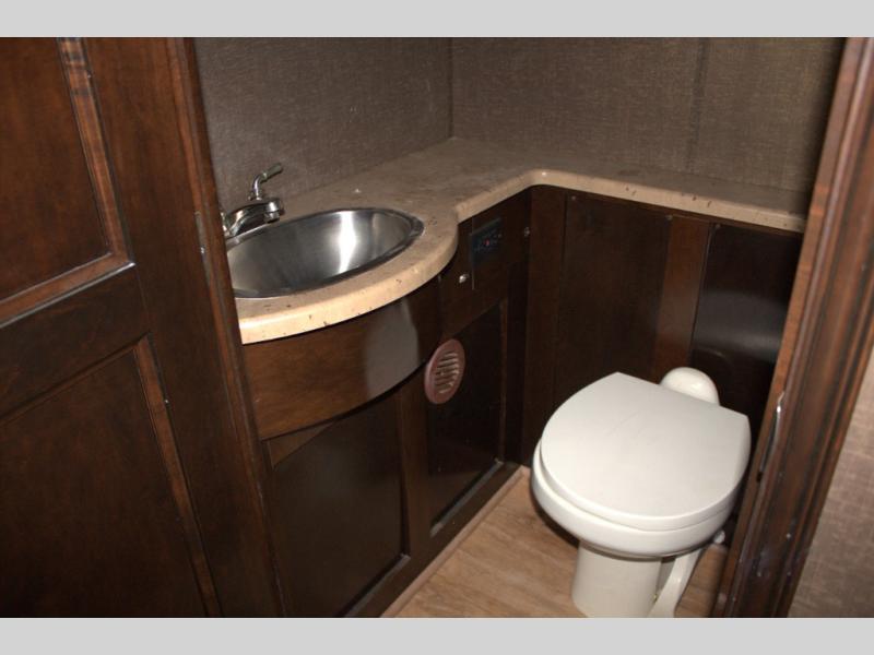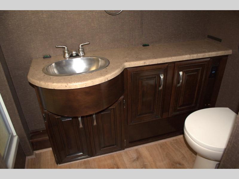 A half bath with a toilet, a large vanity with sink, and overhead cabinets is located mid coach on the road side. The opposite wall includes bunk beds that convert to a sofa and closet which are part of the bedroom slide out.