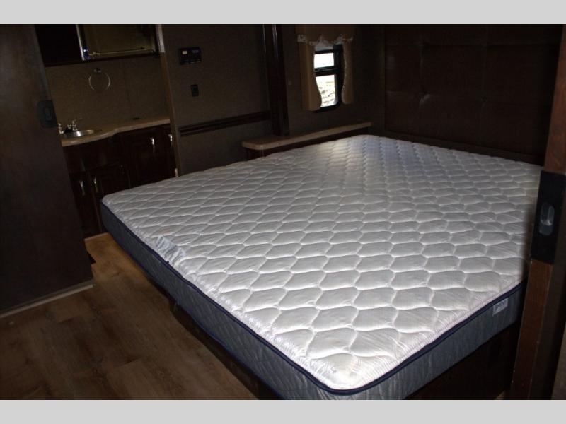 The slide continues in the master bedroom with a washer/dryer prep, two closets, a dresser, and a 32" LED TV above. A king bed slide is on the opposite side with nightstands on each side of the bed and overhead storage.