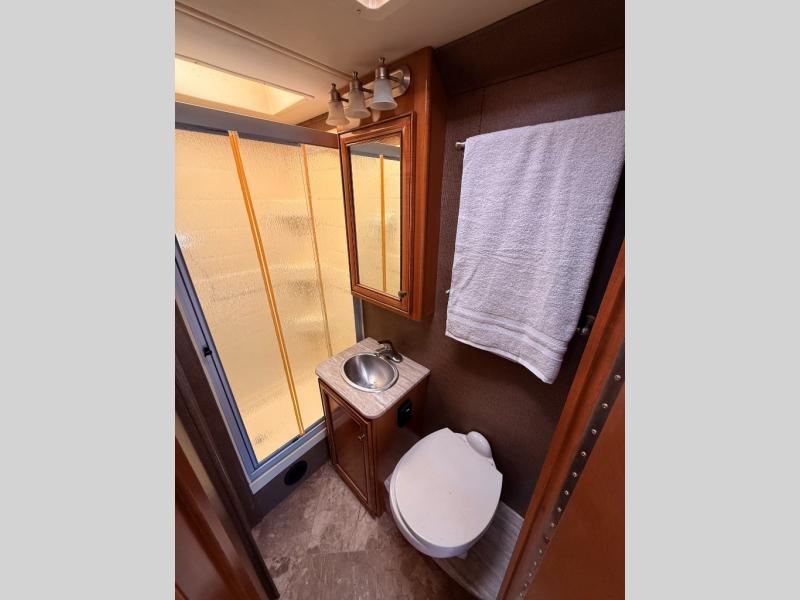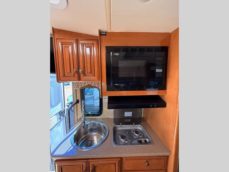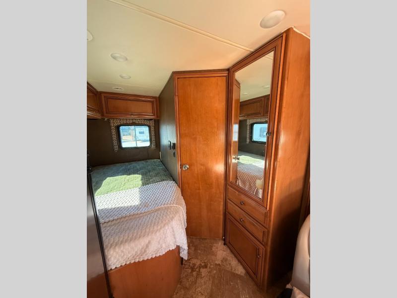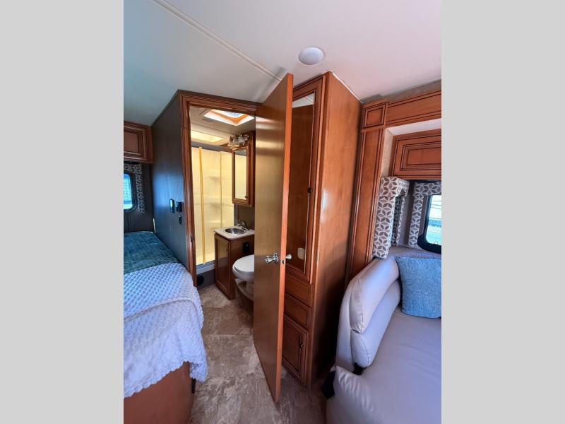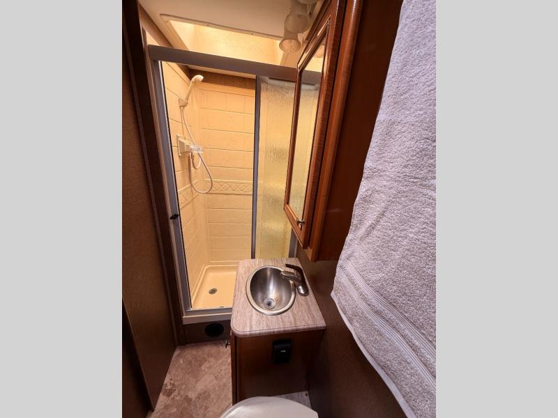 In the rear of the Citation Sprinter 24SA you will find a corner bathroom including a shower, vanity sink, medicine cabinet, and a toilet. There is a closet just outside the bath. The opposite rear corner holds a full size bed with overhead cabinets and optional 24" LED TV.