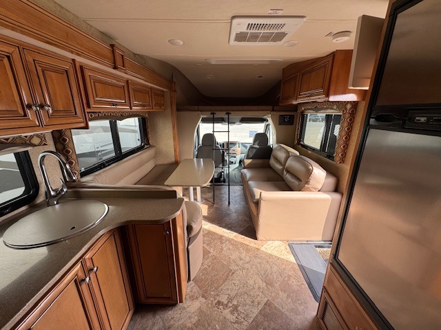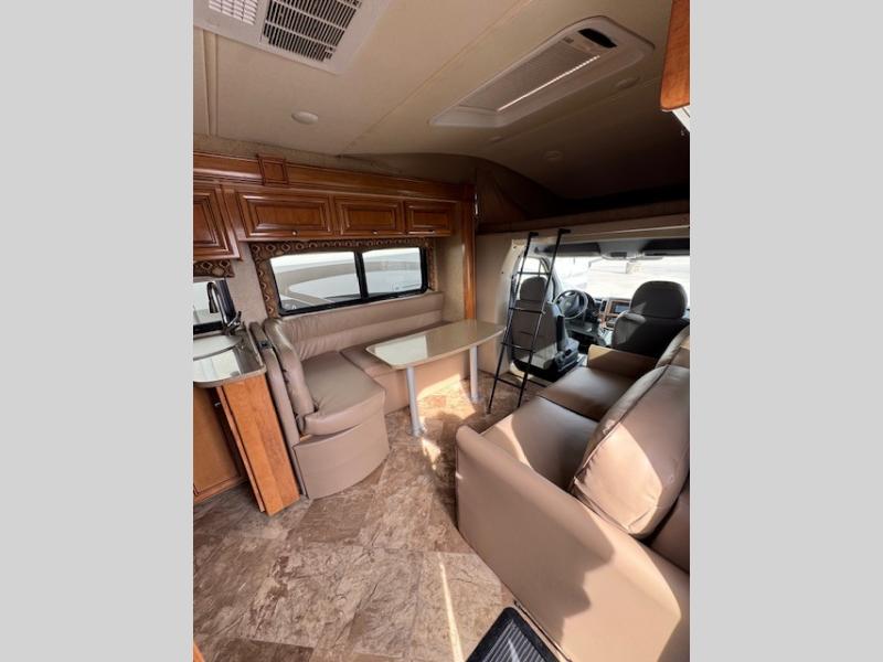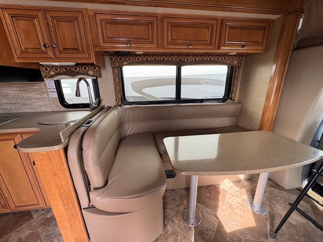 The Citation Sprinter 24SL Class C diesel motor home by Thor Motor Coach features a L-shaped sofa with a pedestal table and a rear bathroom.
