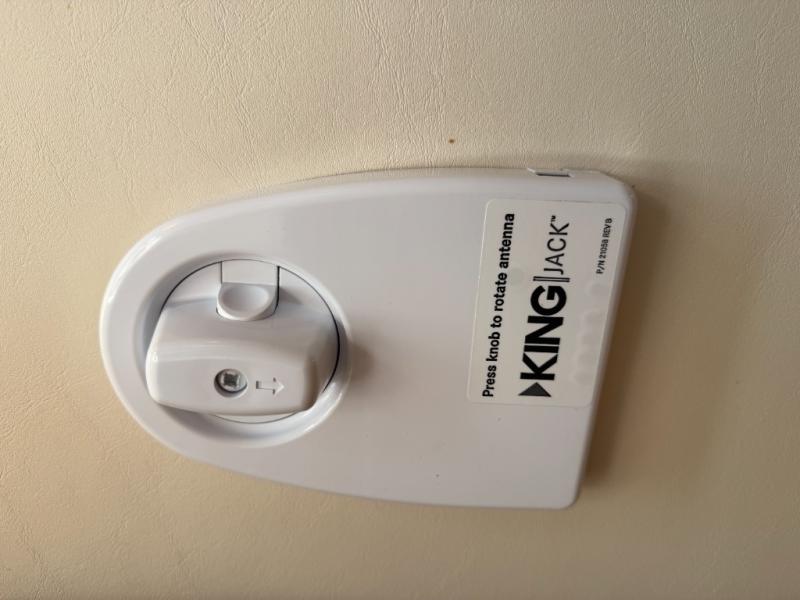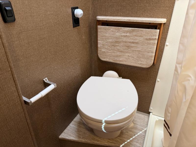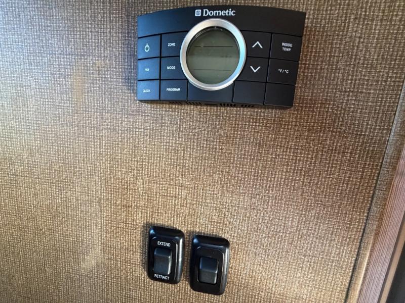 A sofa with air bed and a pedestal table is in the second slide along the road side wall. A 32" LED TV is mounted on the interior wall on a view slide. Extra sleeping space is available in the bunk over the cab.