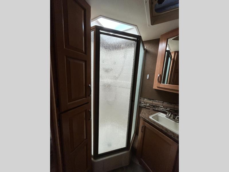 A convenient bath features an angled shower, toilet, sink, and linen cabinet. A large storage closet is located across the hall in the large slide out.