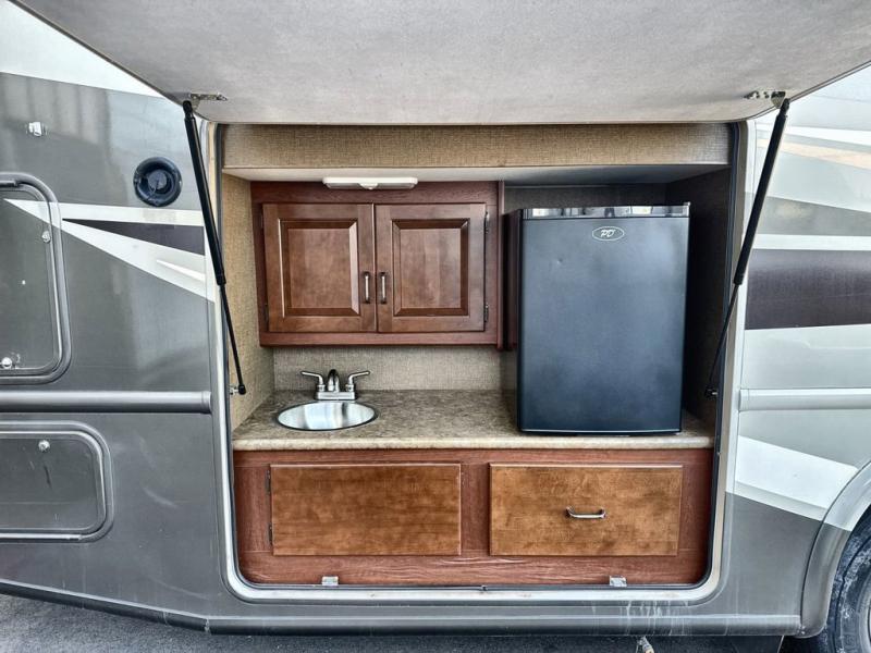 If you enjoy cooking in the outdoors, the optional exterior kitchen includes a 2.6 cu. ft. refrigerator, a sink, portable gas grill, and 1800 watt inverter, plus there is much more to enjoy outside and inside this coach.