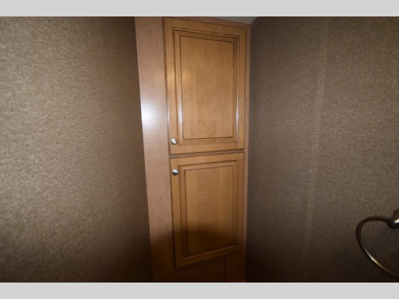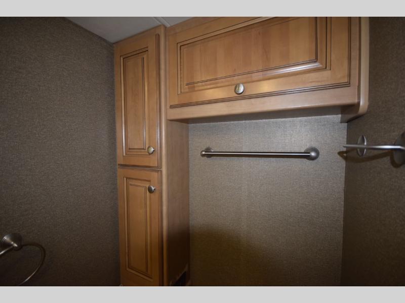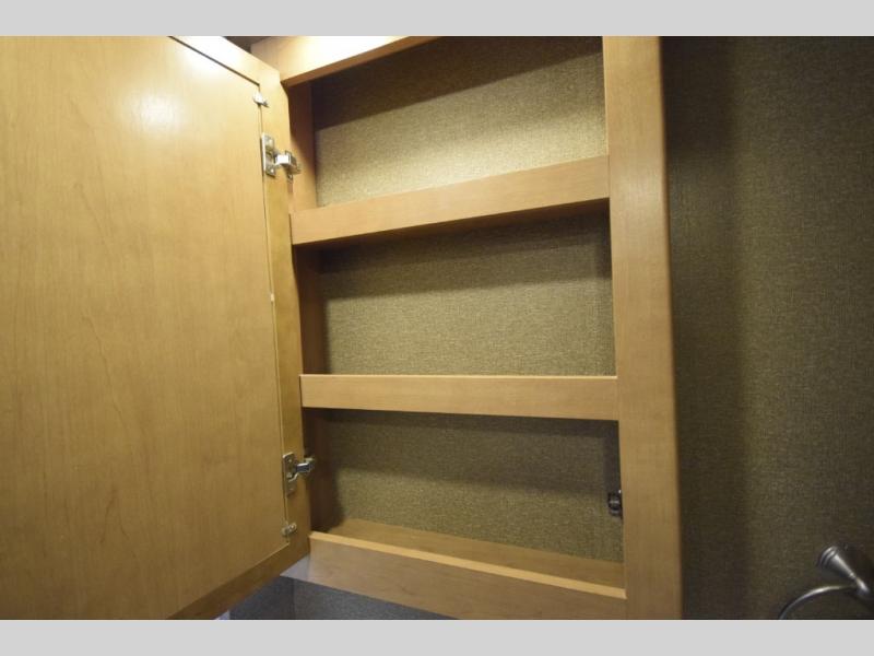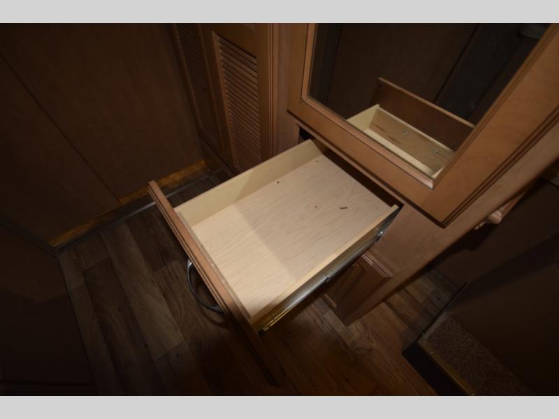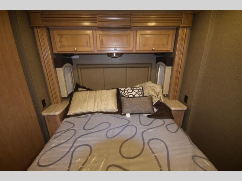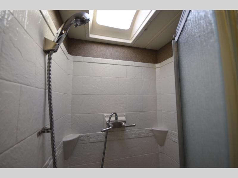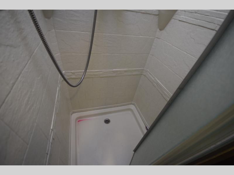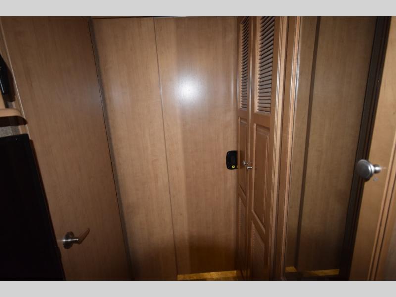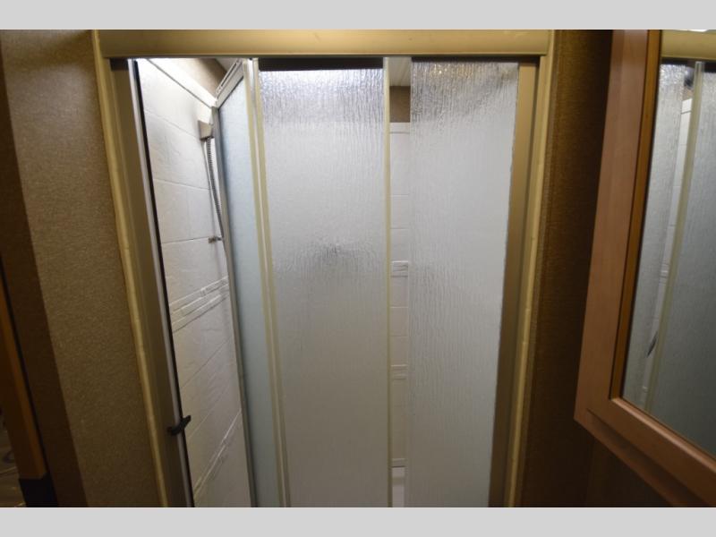 At the end of the day, retreat to the rear master suite with a cozy queen bed, dual nightstands, overhead storage, and built-in closets. Catch up on your favorite shows with the 32” LED TV, or unwind in total peace. The bedroom connects to a luxurious full rear bath, complete with a 32” x 32” shower, vanity, and spacious linen cabinet. A separate half bath mid-coach means fewer wait times — and more convenience on the road.