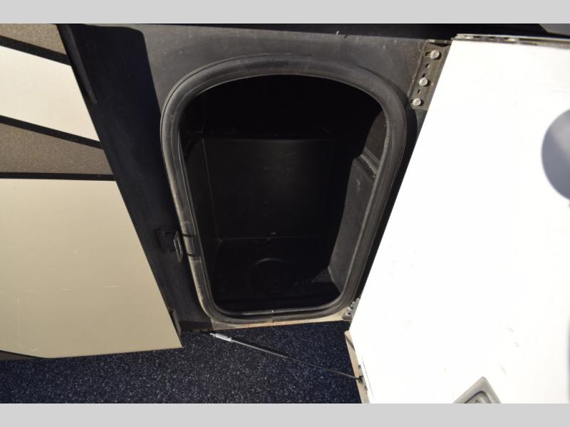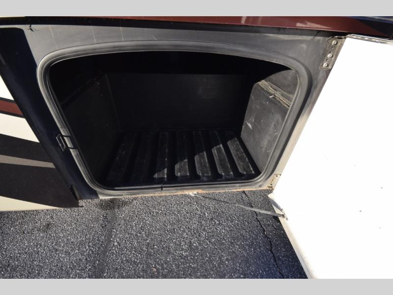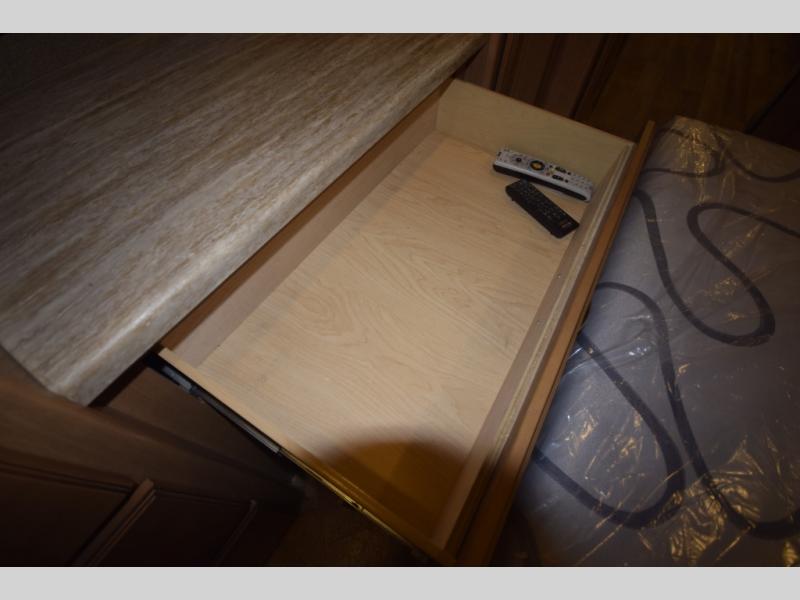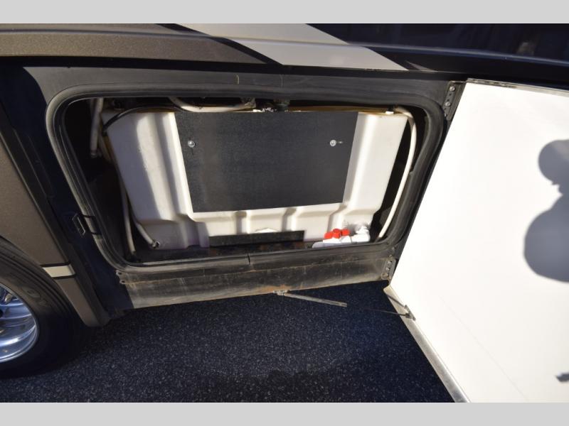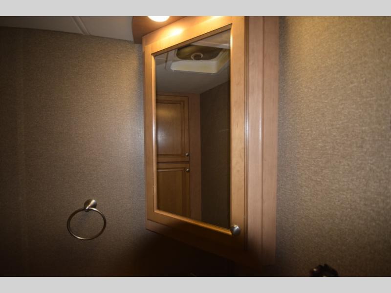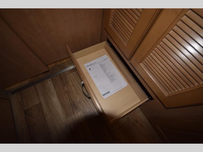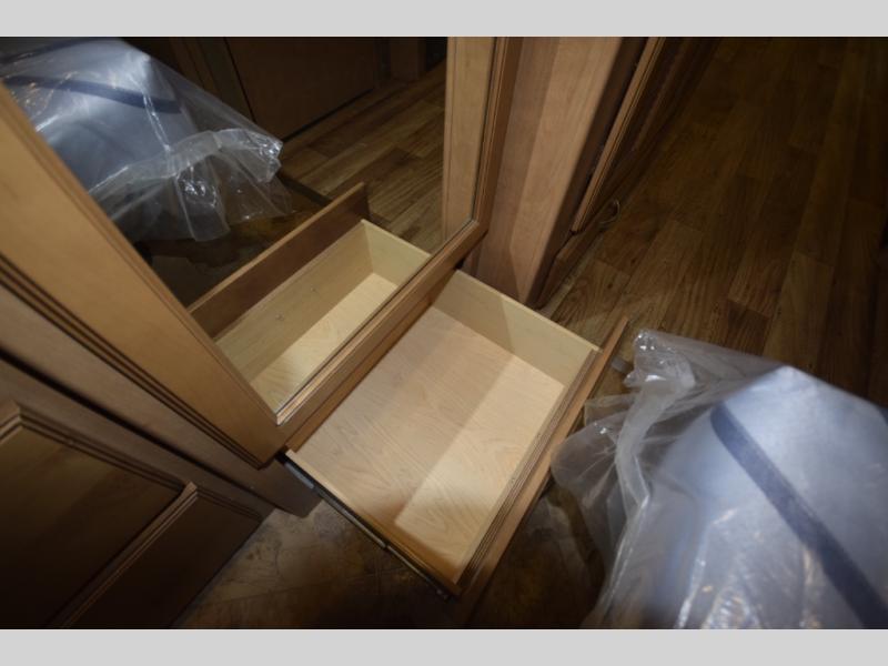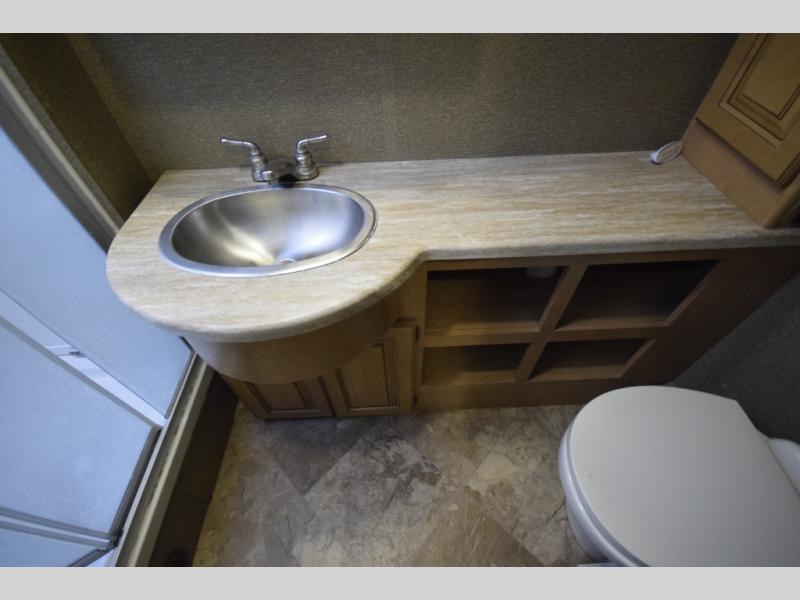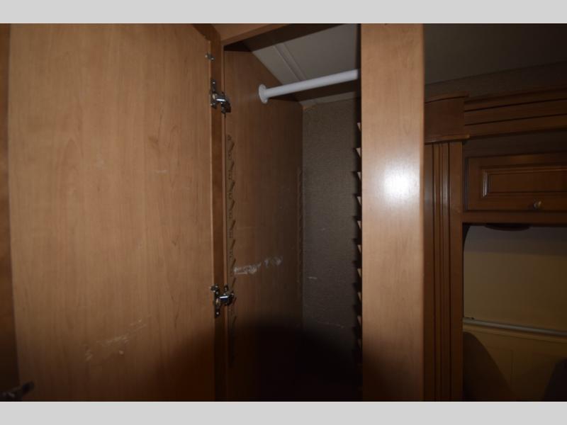 At the end of the day, retreat to the rear master suite with a cozy queen bed, dual nightstands, overhead storage, and built-in closets. Catch up on your favorite shows with the 32” LED TV, or unwind in total peace. The bedroom connects to a luxurious full rear bath, complete with a 32” x 32” shower, vanity, and spacious linen cabinet. A separate half bath mid-coach means fewer wait times — and more convenience on the road.
