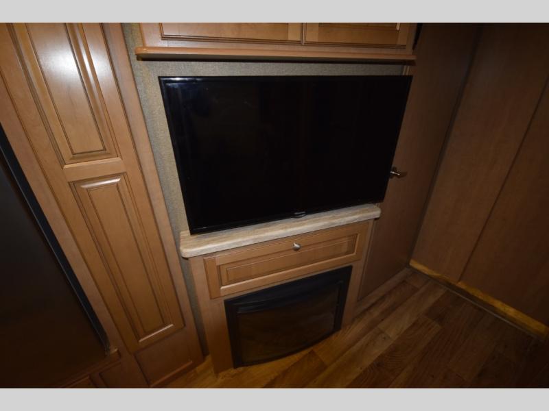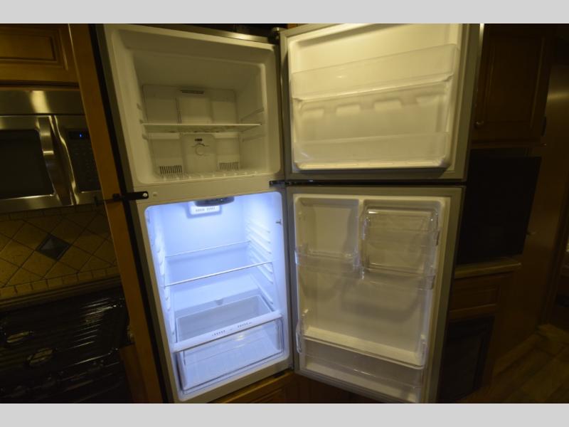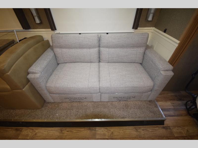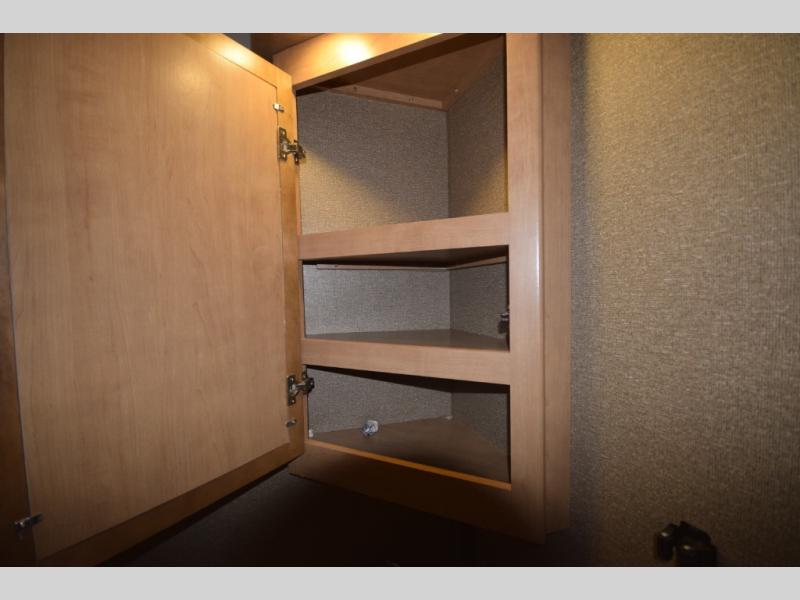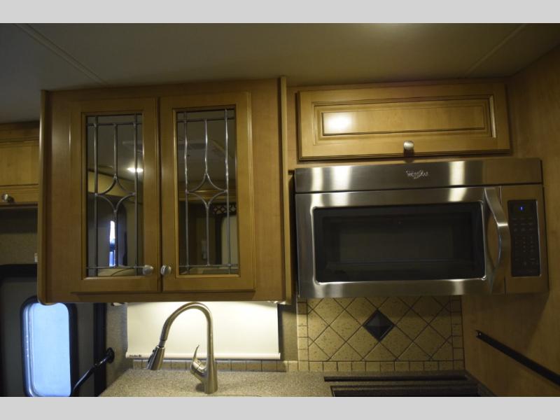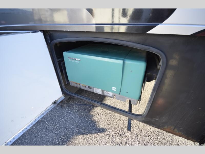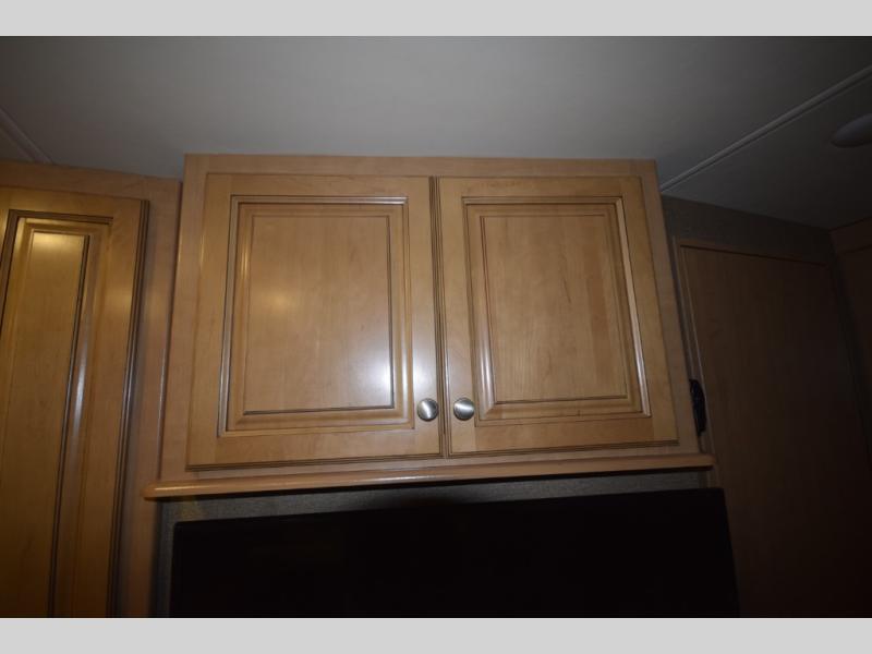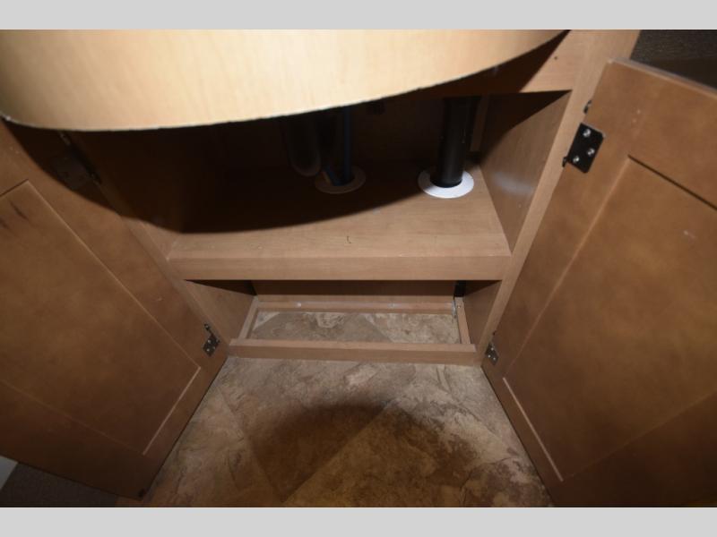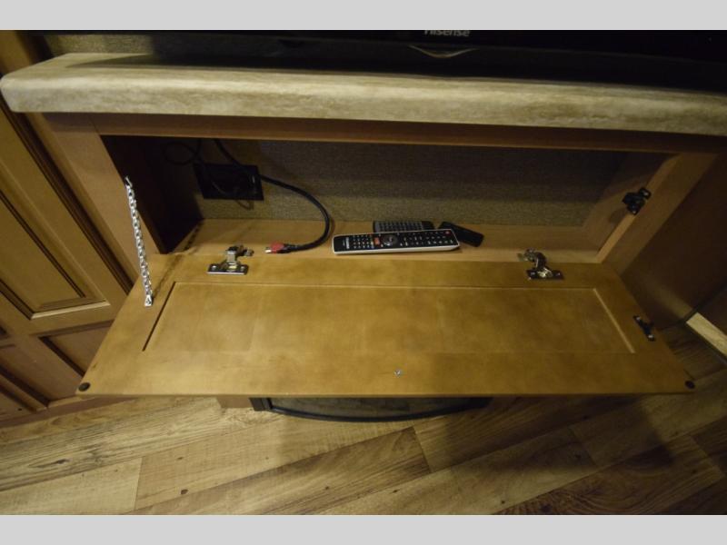 At the end of the day, retreat to the rear master suite with a cozy queen bed, dual nightstands, overhead storage, and built-in closets. Catch up on your favorite shows with the 32” LED TV, or unwind in total peace. The bedroom connects to a luxurious full rear bath, complete with a 32” x 32” shower, vanity, and spacious linen cabinet. A separate half bath mid-coach means fewer wait times — and more convenience on the road.