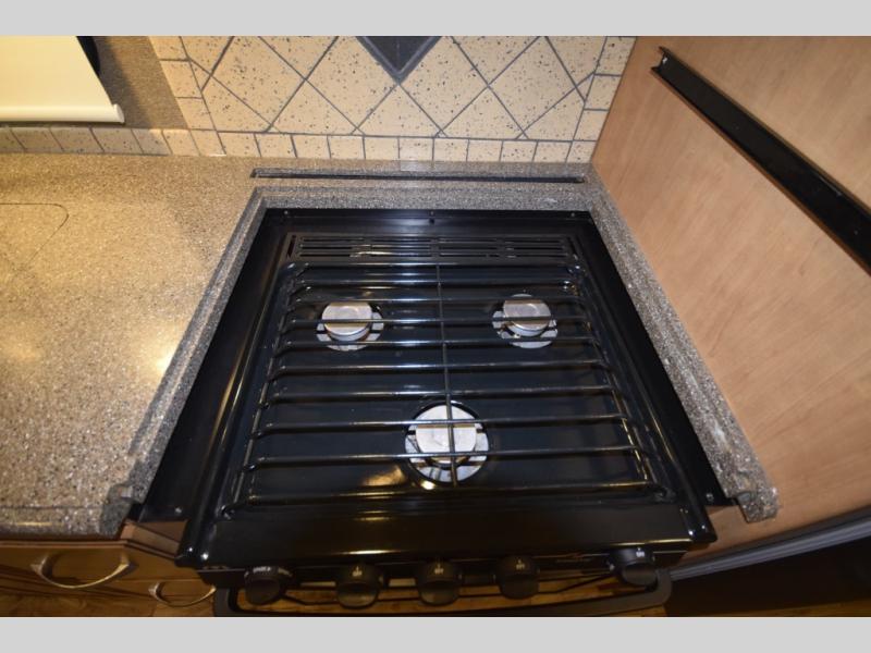 Whip up meals like a pro with the fully equipped kitchen, featuring a residential refrigerator, three-burner range, microwave oven, and generous pantry storage. Clean-up is easy with the double sink and ample counter space for prep work. Whether it's a quick breakfast or a campsite feast, this kitchen is ready for action.