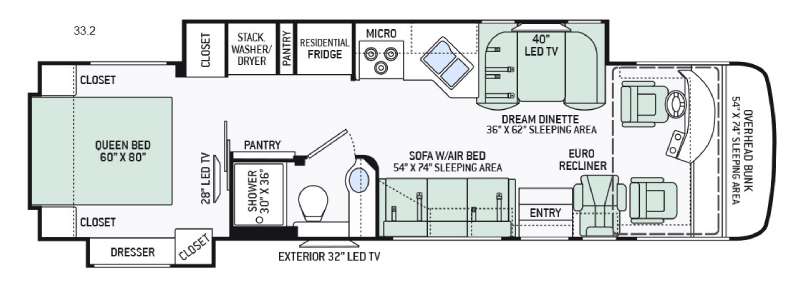 Immediately to the right of the entry is a euro recliner. There is an overhead bunk included above the cab for additional sleeping space.