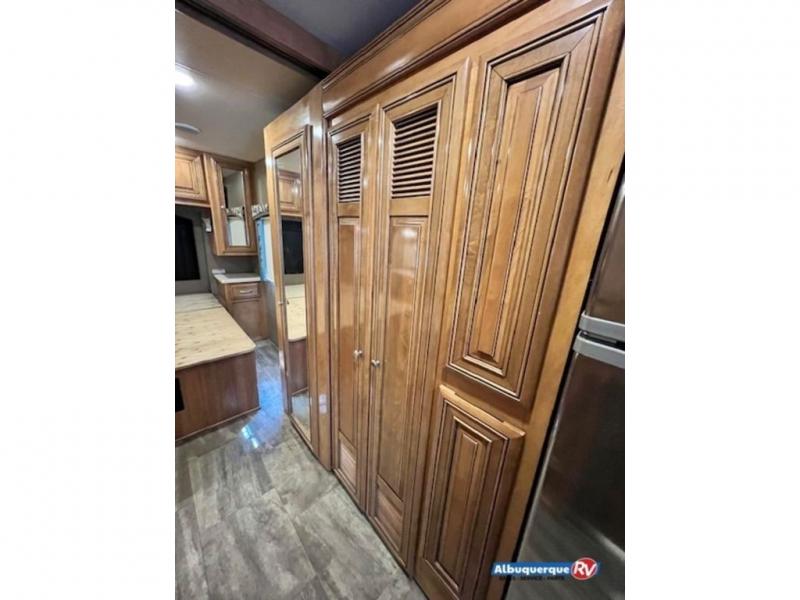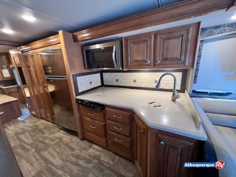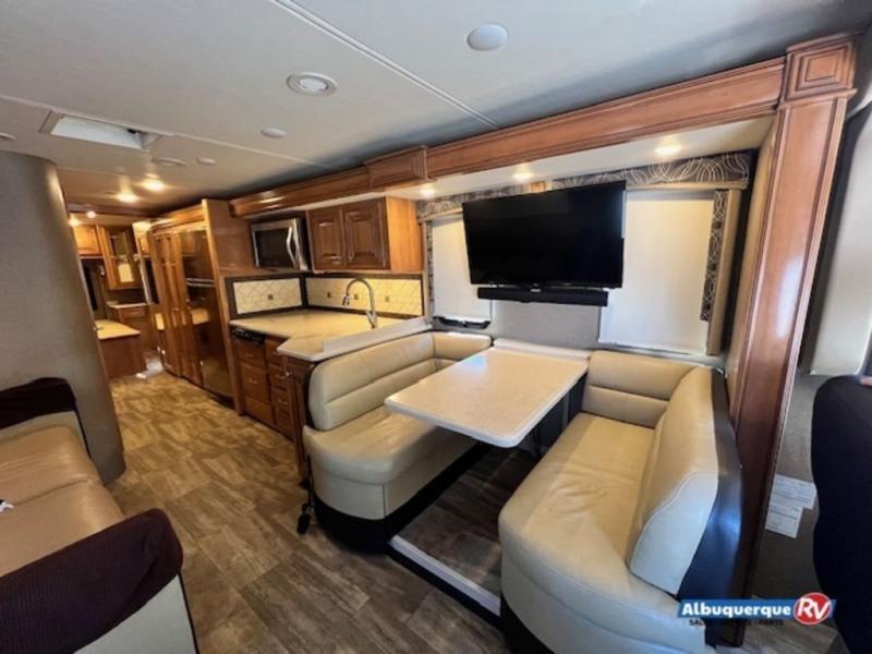 Along the road side, a generous slide out has a dream dinette booth with a 40" LED TV mounted above it. There is also an angled double bowl sink, three burner range, microwave, overhead cabinets, a refrigerator, pantry, stackable washer/dryer and a closet.