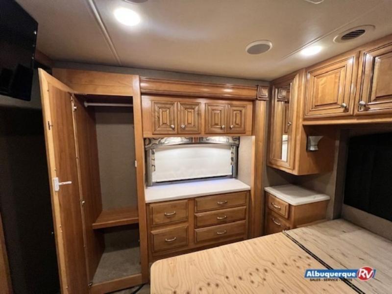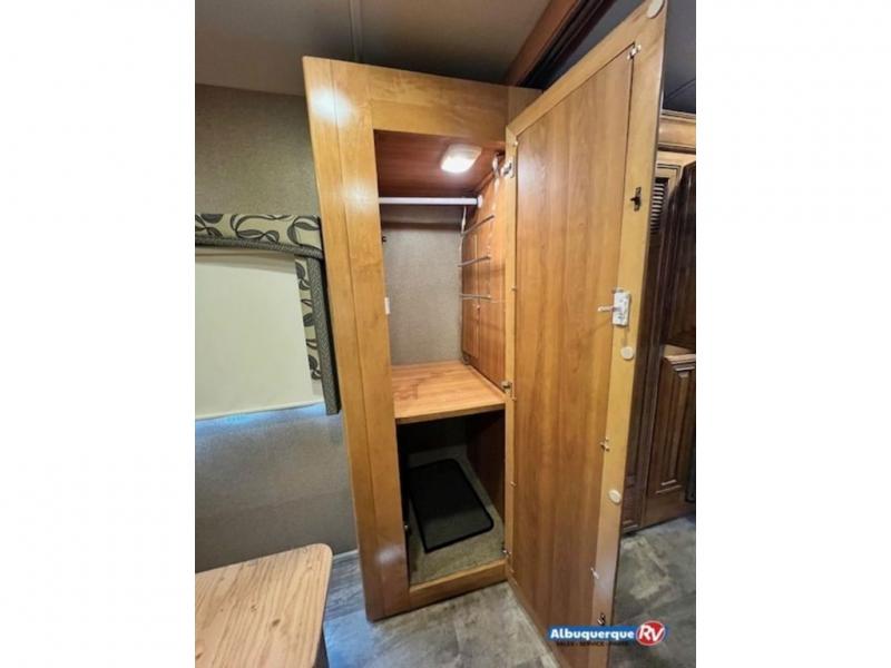 The rear bedroom includes a queen bed with closets at each side and an overhead cabinet. The closet within the generous living area slide is in the bedroom. A slide out on the opposite wall holds a dresser and another closet. A 28" LED TV is on the wall opposite the bed.