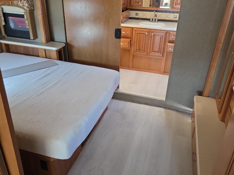 The bedroom includes the closets, dresser and a 28" LED TV within the road side slide along with a queen bed with nightstands and overhead cabinets within another slide.