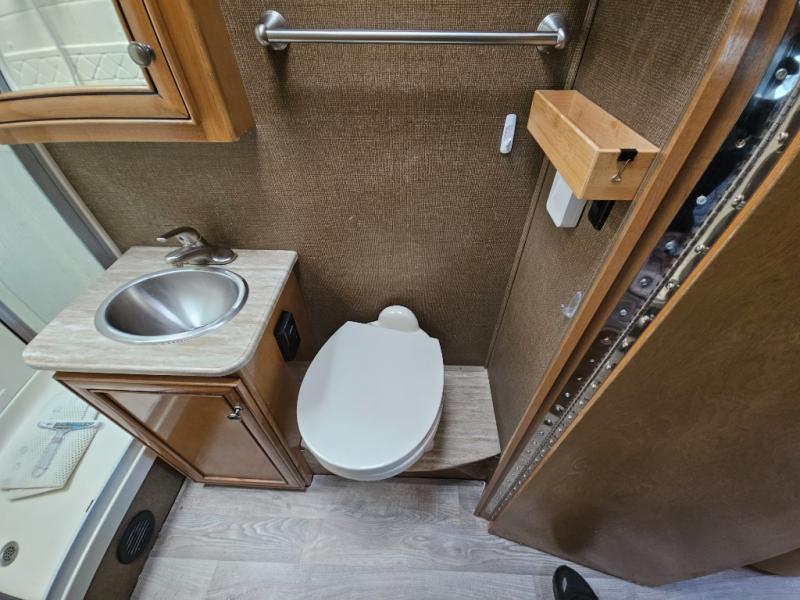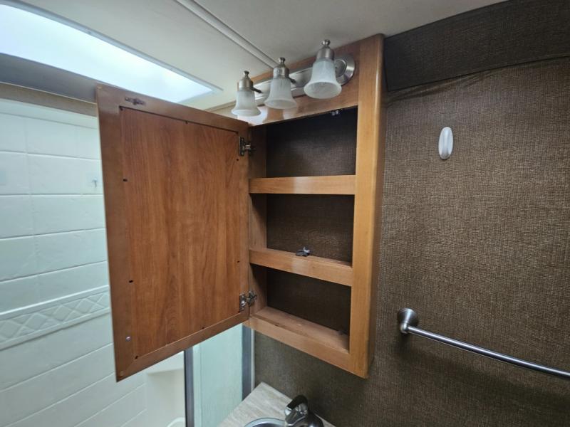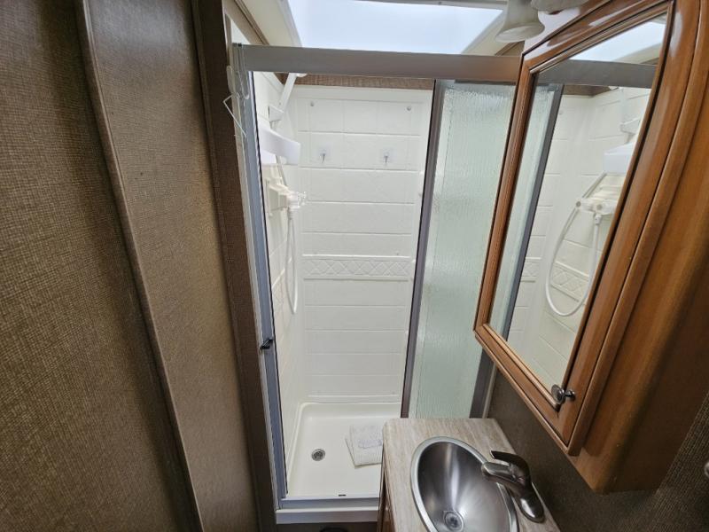 In the rear of the Siesta Sprinter 24SA you will find a corner bathroom including a shower, vanity sink, medicine cabinet, and a toilet. There is a closet just outside the bath. The opposite rear corner holds a full size bed with overhead cabinets and optional 24" LED TV.