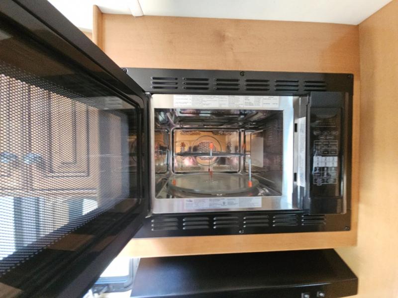 A 24" LED TV is mounted over the entry door. To the left of the door, the kitchen features a single round sink, overhead cabinets, a two burner range top, overhead microwave, and a refrigerator.