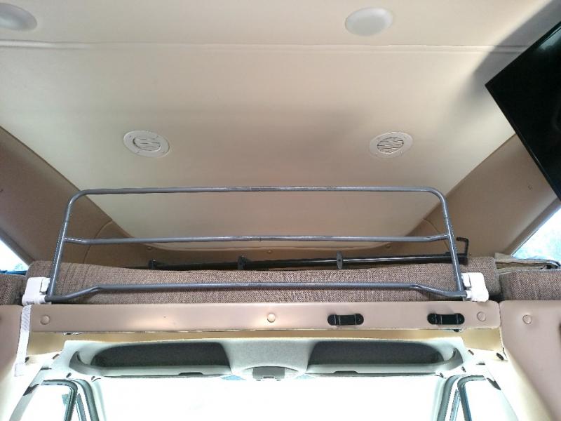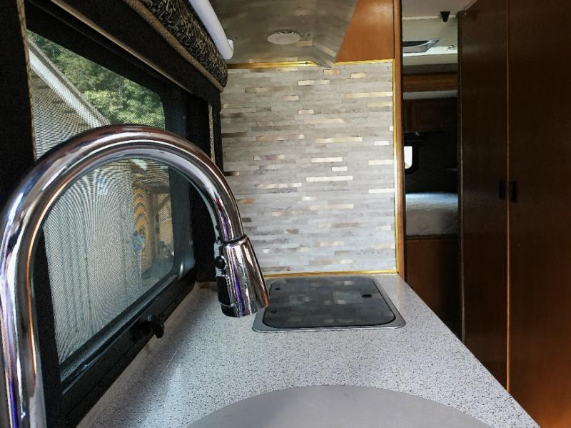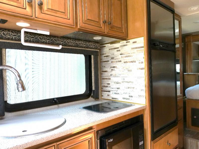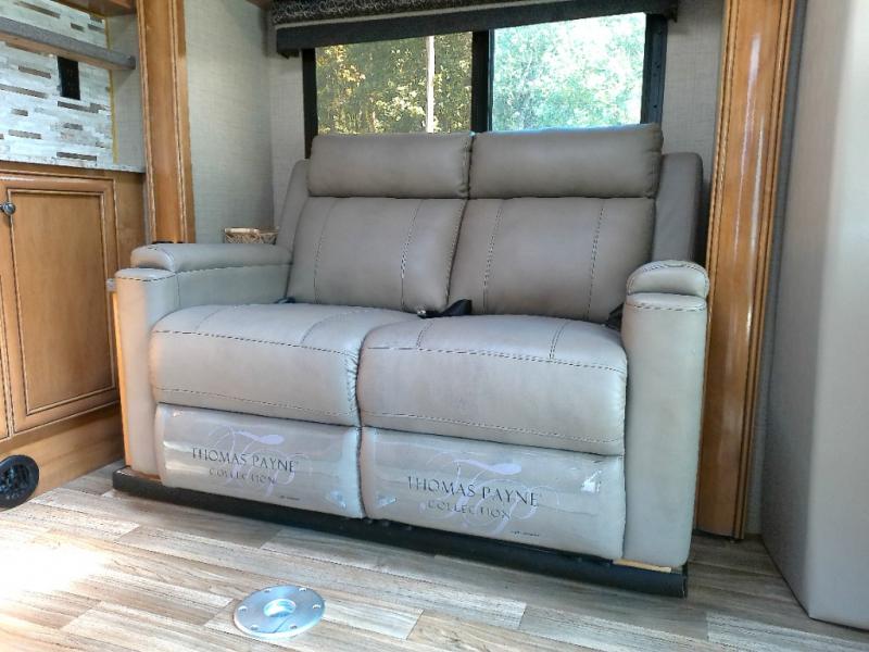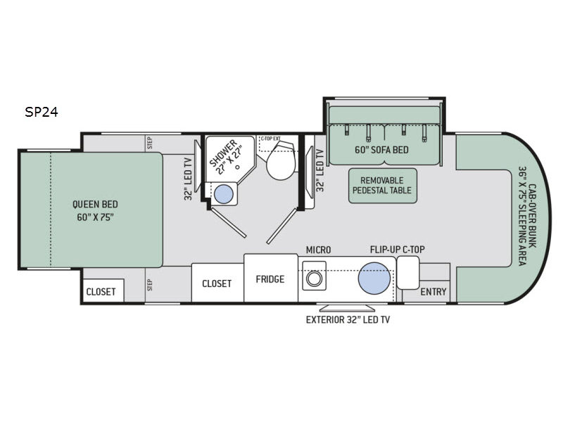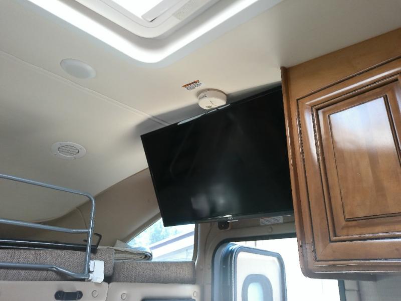 As you enter this model, above the cab you will find a 36" x 75" sleeping space for one adult or a child. The slide out located behind the driver's seat has a sofa bed and a removable pedestal table. At night the sofa converts into additional sleeping space. Adjacent to the slide you can enjoy watching movies at the 32" LED TV.