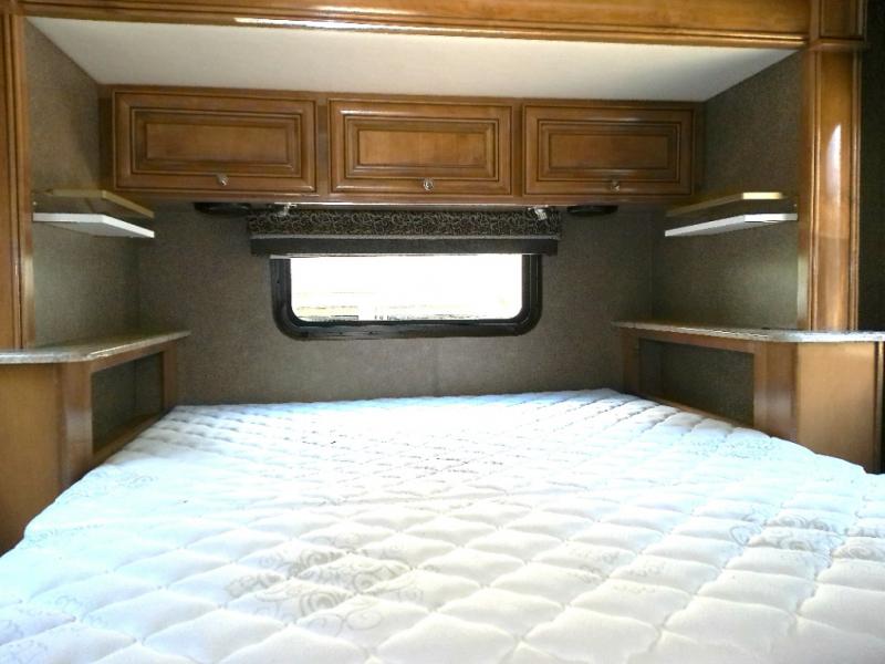 Located in the rear of this motor home is the bedroom with a rear slide out queen bed including overhead storage, and a 32" LED TV on the interior wall. The bed is a step up from the main part of the coach.