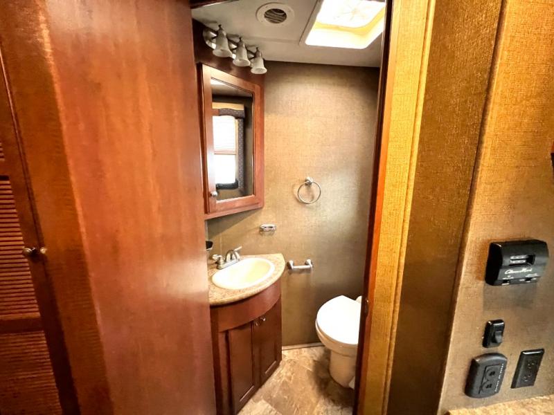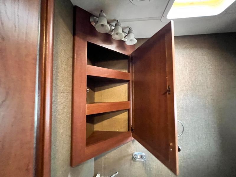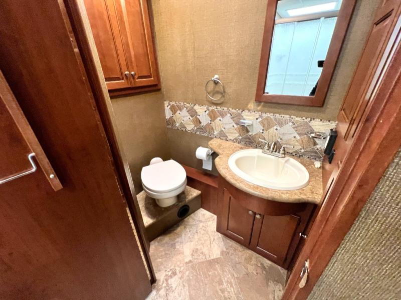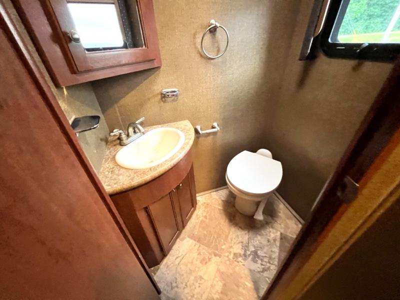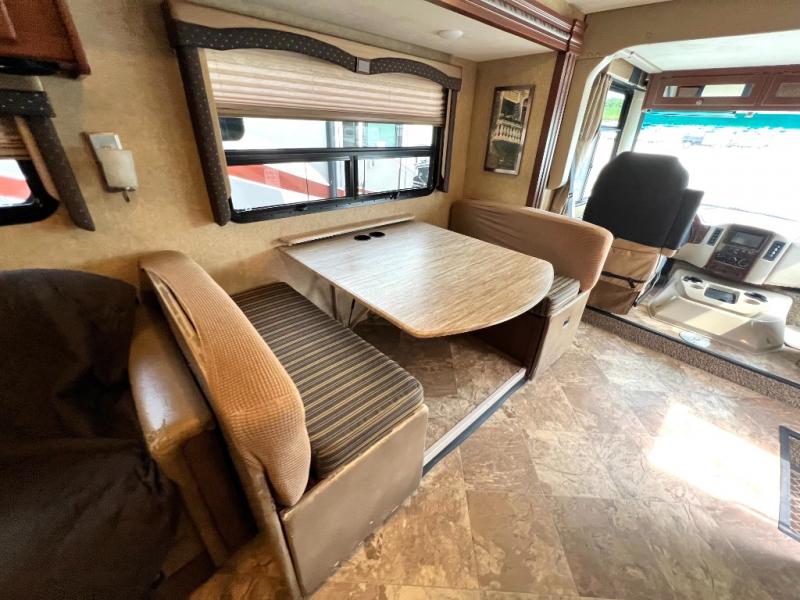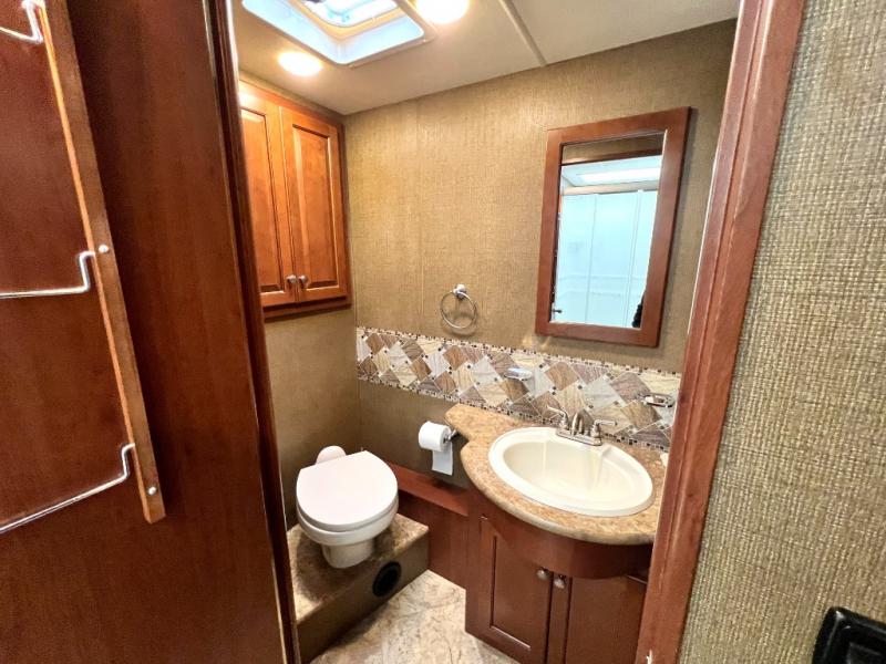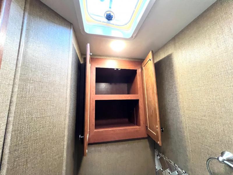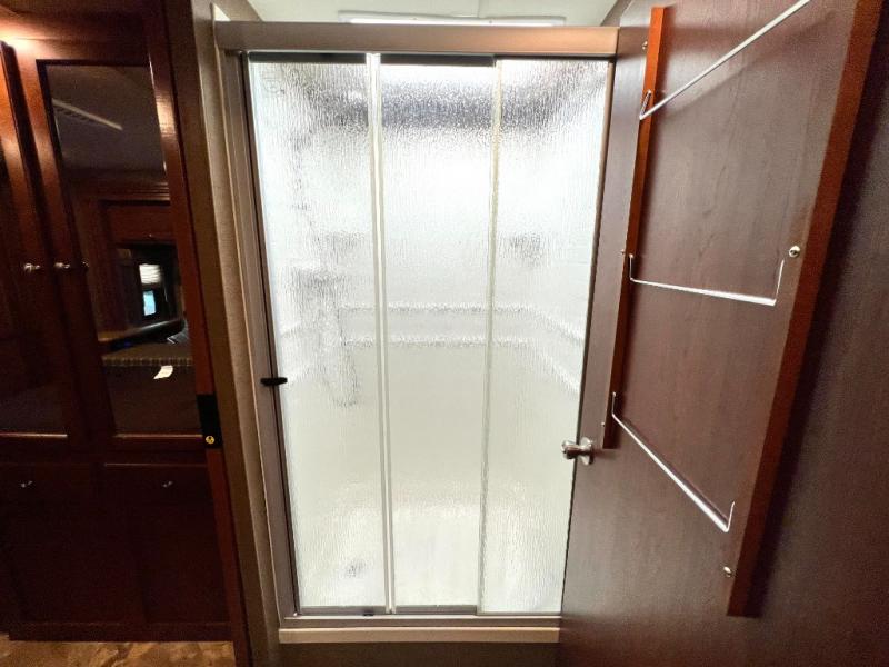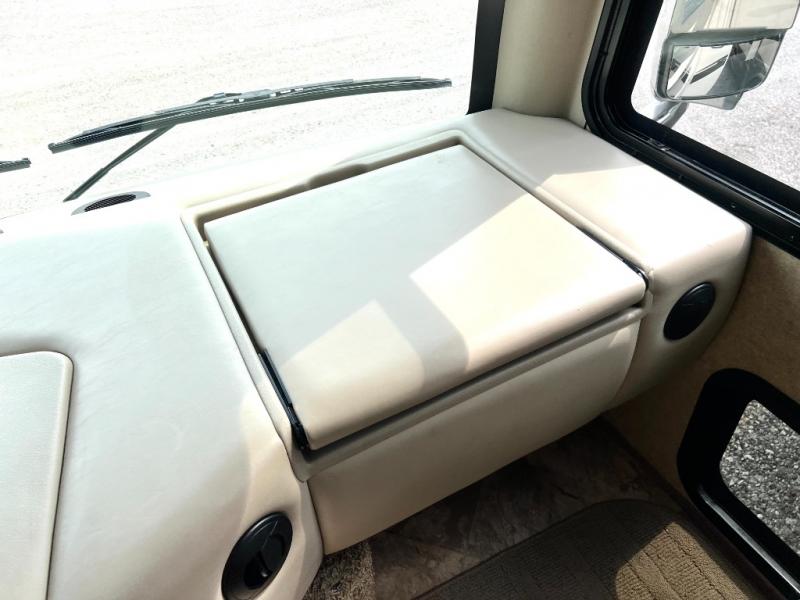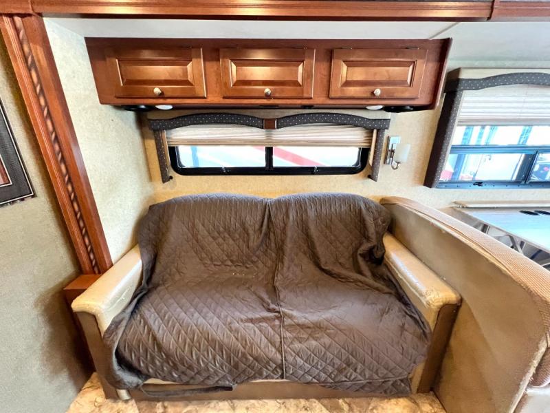 Step inside model 35C and see just how convenient your next road trip can be. There is a slide out dream dinette and theater seating for two opposite the entry door. With overhead storage above the theater seating, and two sets of seat belts, all of your guests and cabinet items will be secure while traveling. There is also a drop down overhead bunk above the cab area for added sleeping space if needed as well. The convenient coffee table between the captain's chairs allows for more table top space for just about anything. You can also choose a sofa with air bed in place of the theater seats if you like. Enjoy the 40" LED TV along the outer bathroom wall.