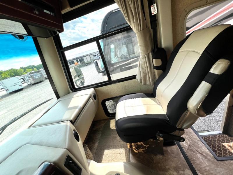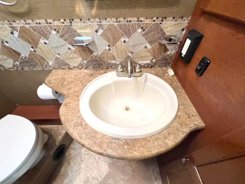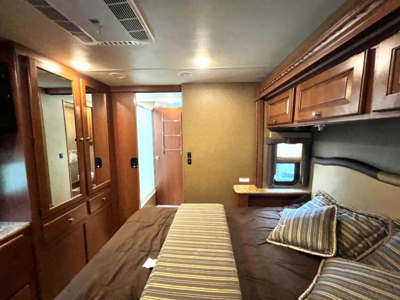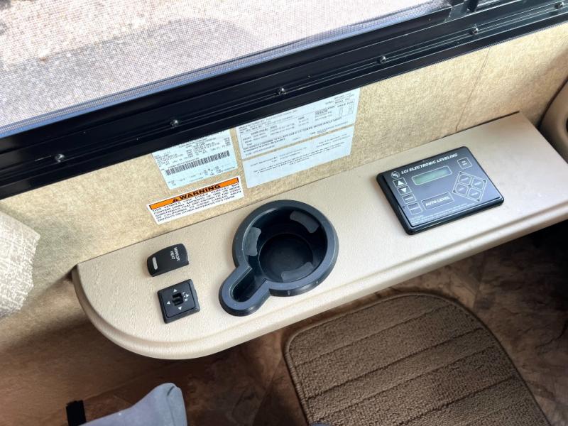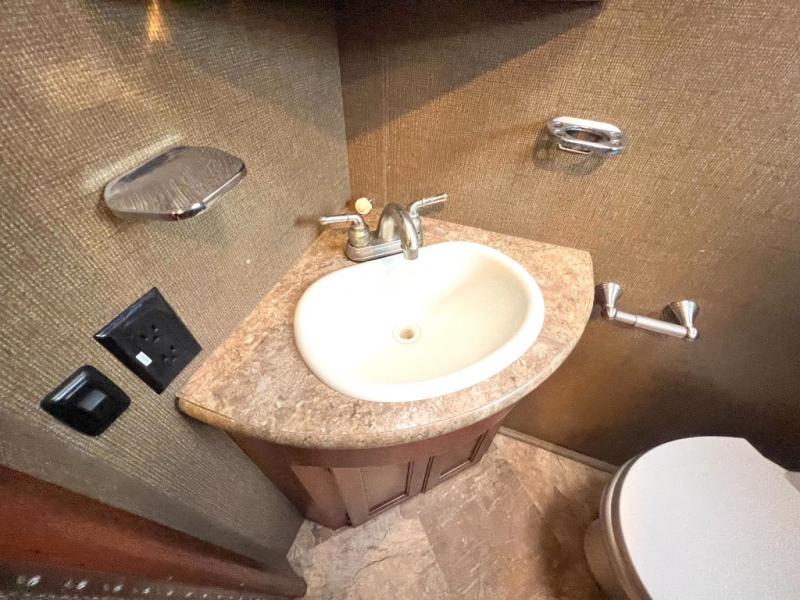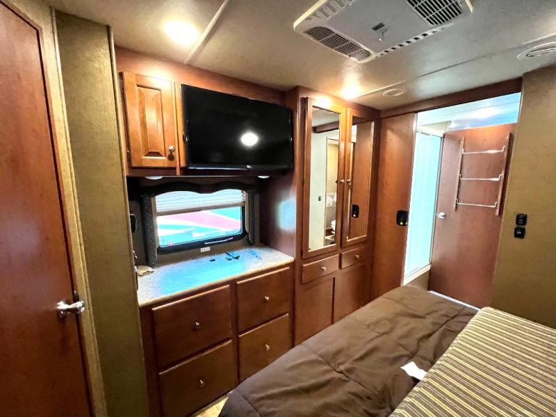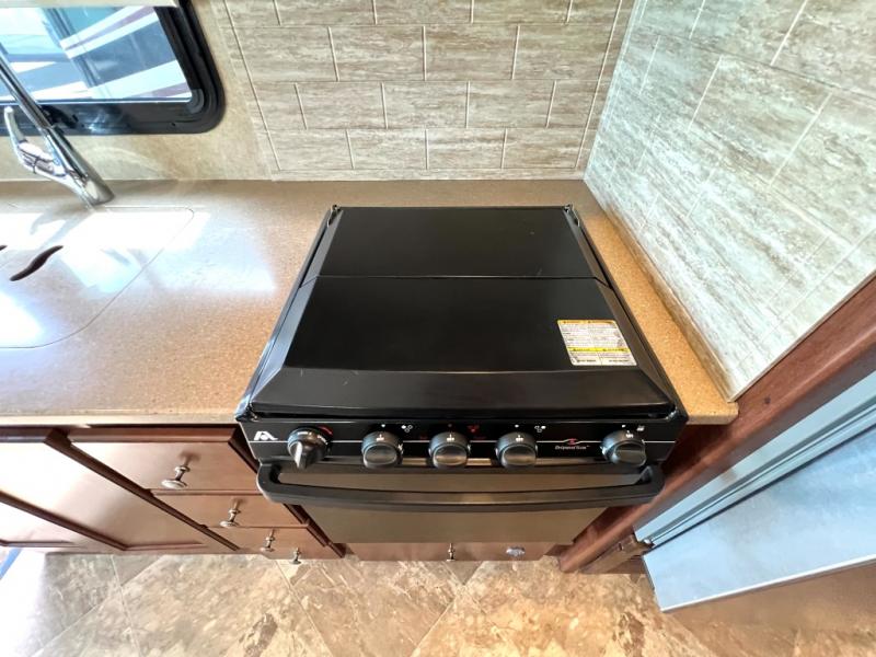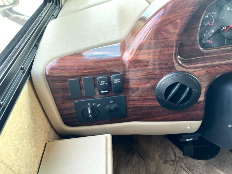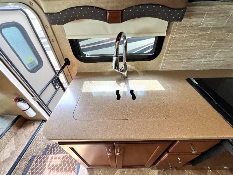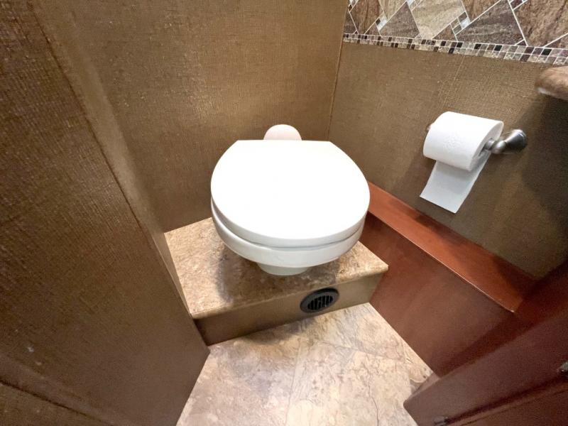 Step inside model 35C and see just how convenient your next road trip can be. There is a slide out dream dinette and theater seating for two opposite the entry door. With overhead storage above the theater seating, and two sets of seat belts, all of your guests and cabinet items will be secure while traveling. There is also a drop down overhead bunk above the cab area for added sleeping space if needed as well. The convenient coffee table between the captain's chairs allows for more table top space for just about anything. You can also choose a sofa with air bed in place of the theater seats if you like. Enjoy the 40" LED TV along the outer bathroom wall.
