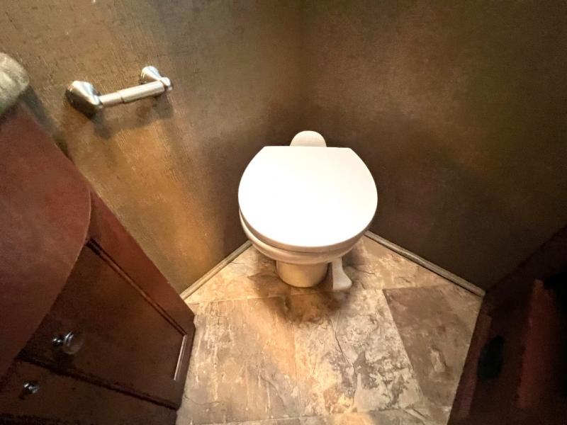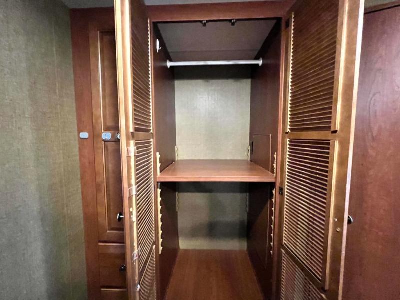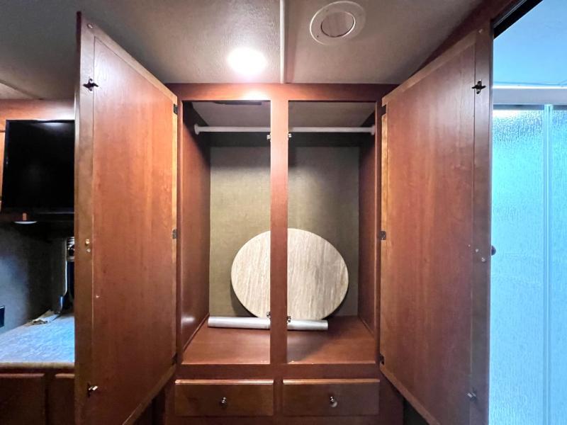 In the master bedroom you will find a slide out queen size bed with nightstands on both sides along with overhead storage above the head of the bed. Opposite find a wardrobe and dresser with an optional 32" LED TV. Across the rear wall there are pull-out shelves, a wardrobe that has been prepped for a washer/dryer, and a half bath mentioned above with a toilet, vanity with sink, plus overhead cabinet.