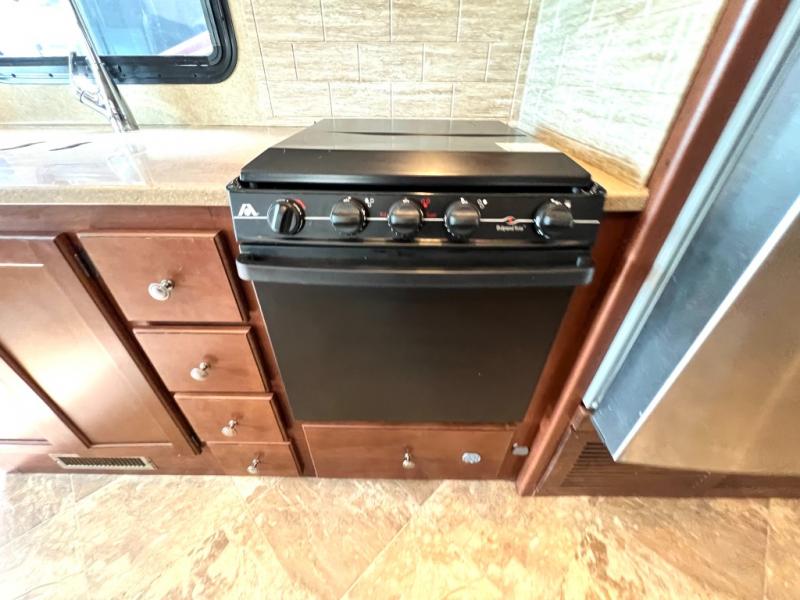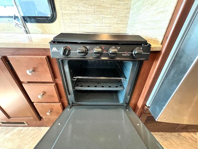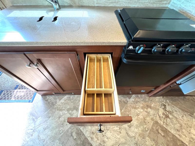 To the left of the entry door find a kitchen with all the amenities needed to create gourmet meals and snacks on the go. There is a double kitchen sink, a three burner range with overhead microwave oven, residential refrigerator, and a pull-out pantry. The pull-out pantry offers plenty of storage for dry and canned food items you wish to take along.
