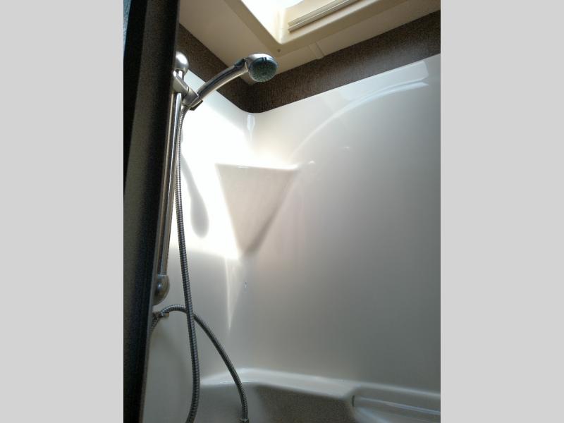 A sliding door blocks off the bedroom and bathroom space from the front living area. When you enter you will find a shower on your right and private toilet and vanity with sink on your left including some overhead storage cabinets.