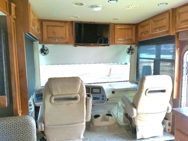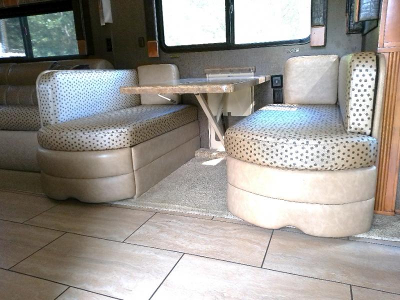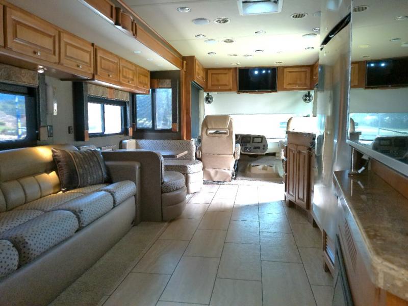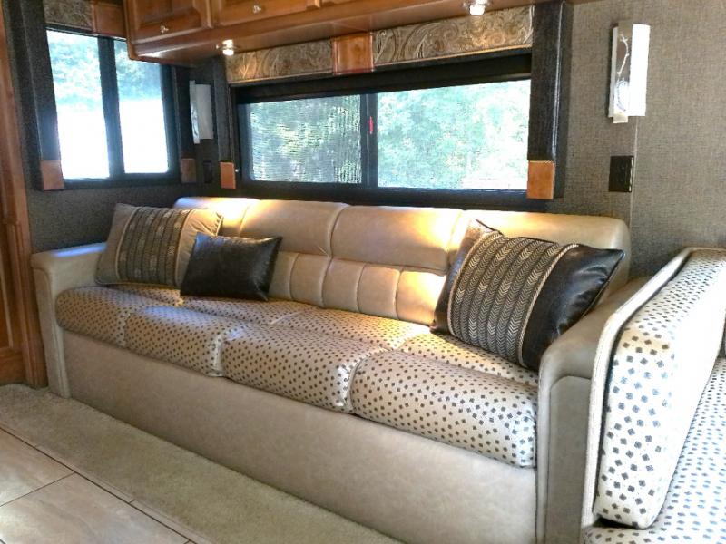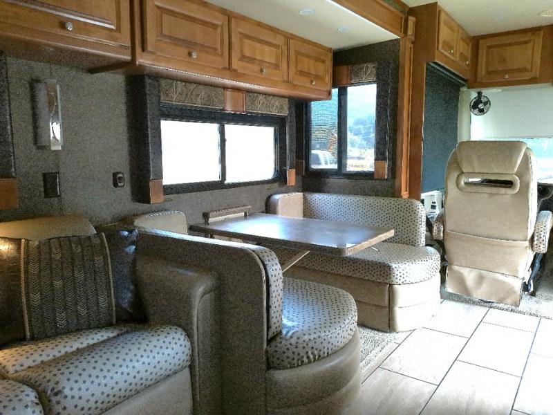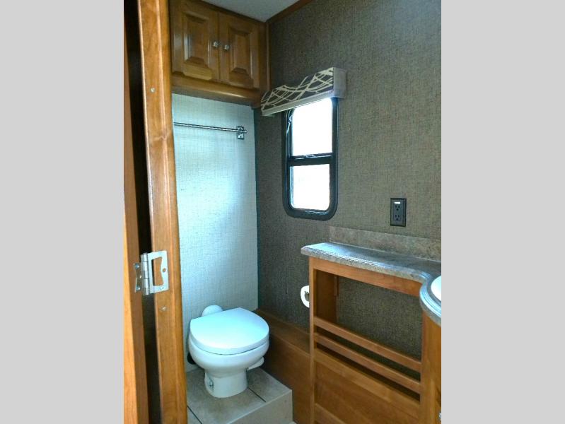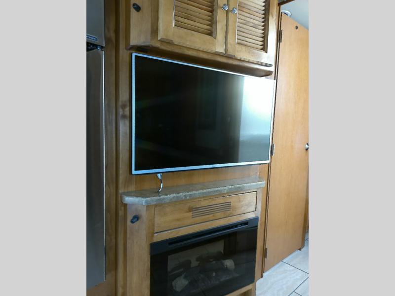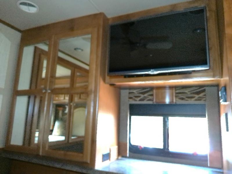 On the right side find a booth dinette and sofa with overhead cabinet. You can even choose have an optional dinette with computer station and a l-shaped chaise sofa bed with coffee table. A standard TV is mounted along the outer bathroom wall for perfect viewing from any seating in the room.
