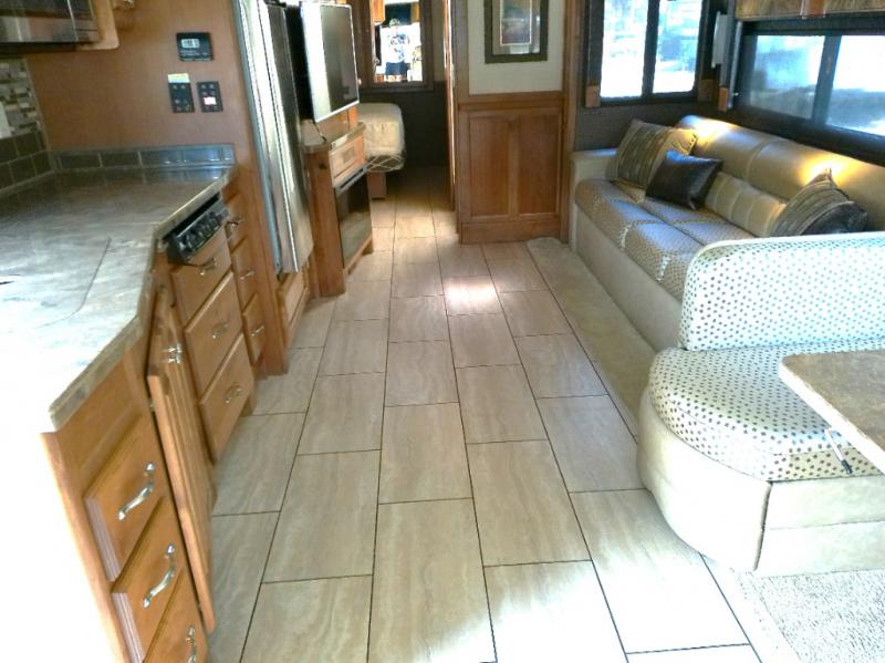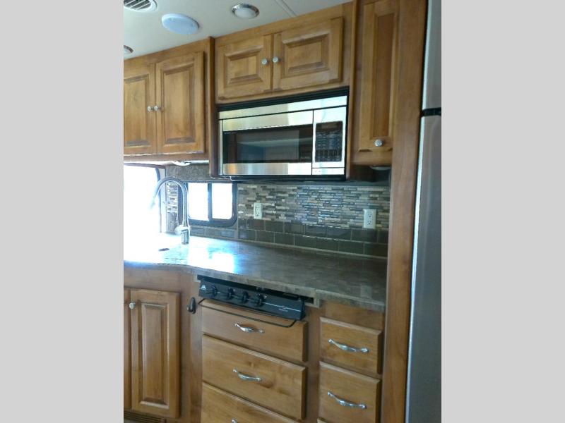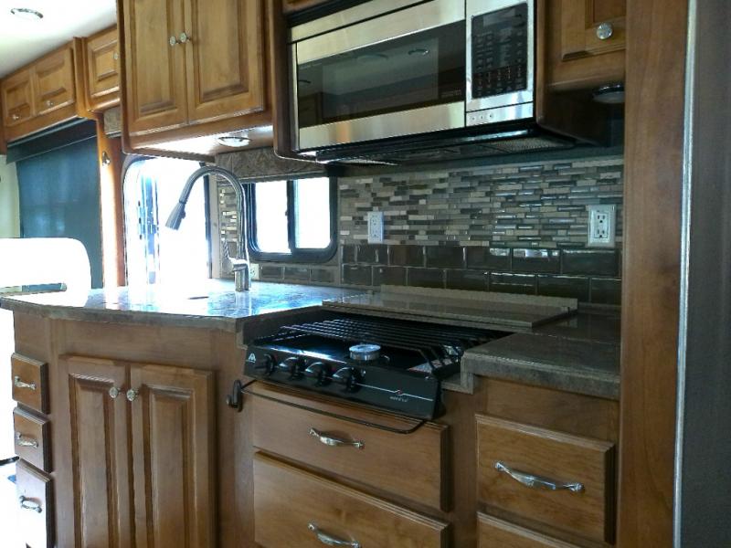 Enter the side door behind the passenger seat . Once inside take a look back and see just how spacious the interior is. There is a double sink, three burner range with microwave overhead, refrigerator, and pantry on the curb side just beyond the entry door. So, cooking your favorite gourmet meals will be a cinch!