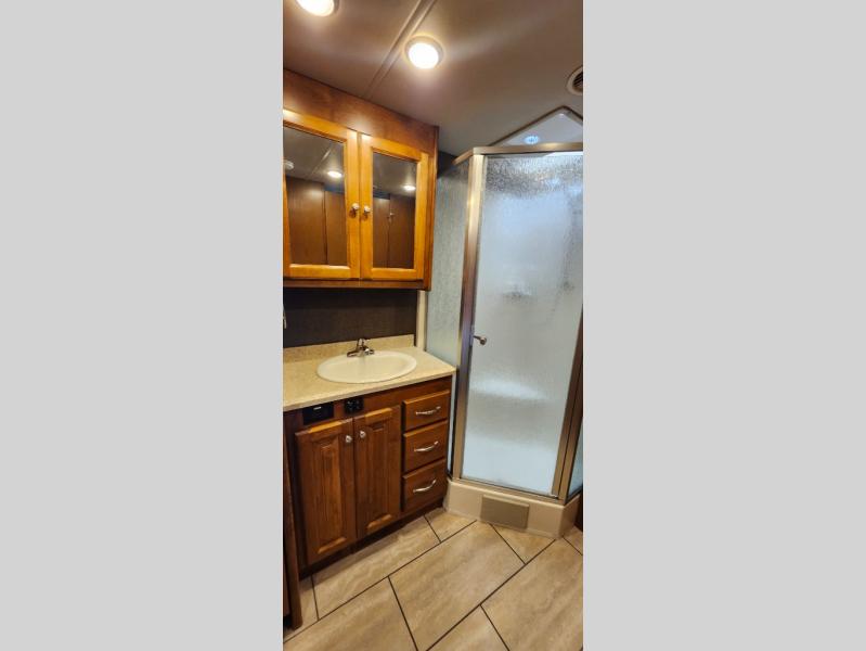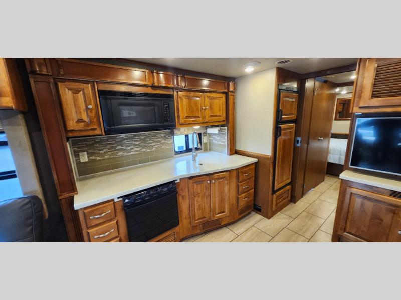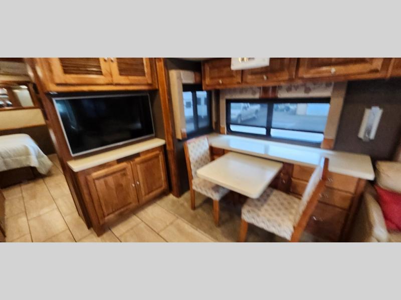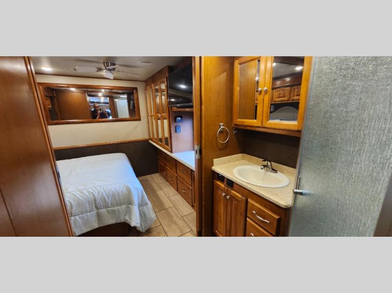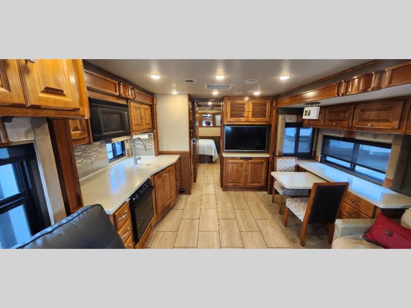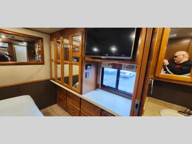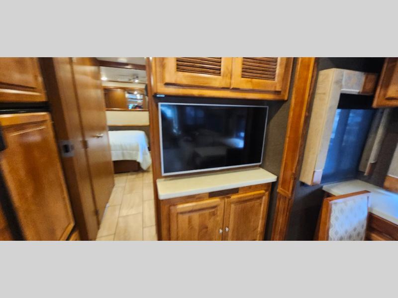 A large slide out on the driver's side has a sofa bed, a booth dinette and overhead cabinets. A standard TV with a pantry below is on an inside wall and the TV faces the front of the coach. In place of the booth dinette, you may choose a dinette with computer workstation, plus more!