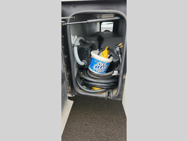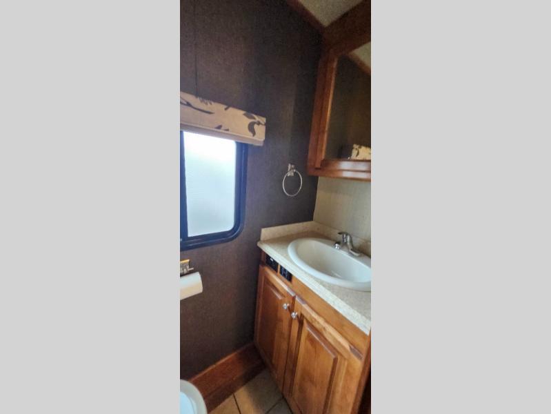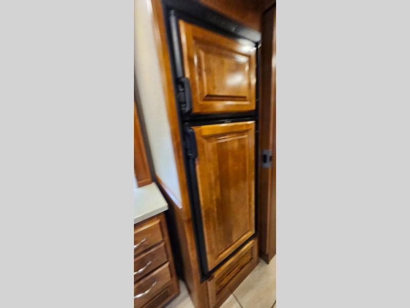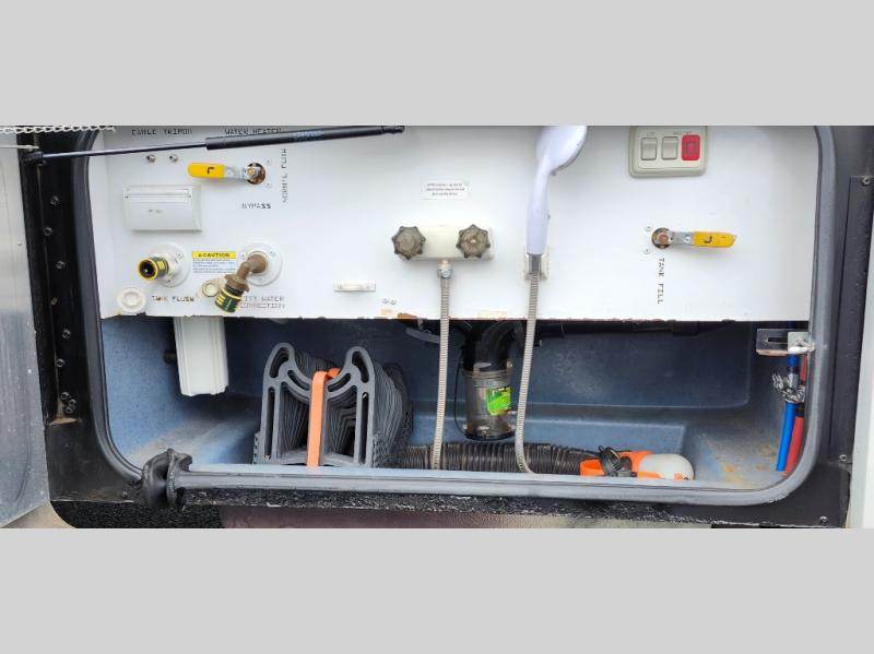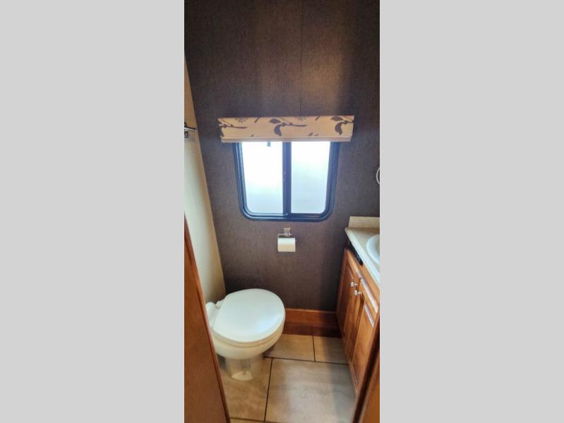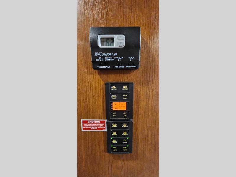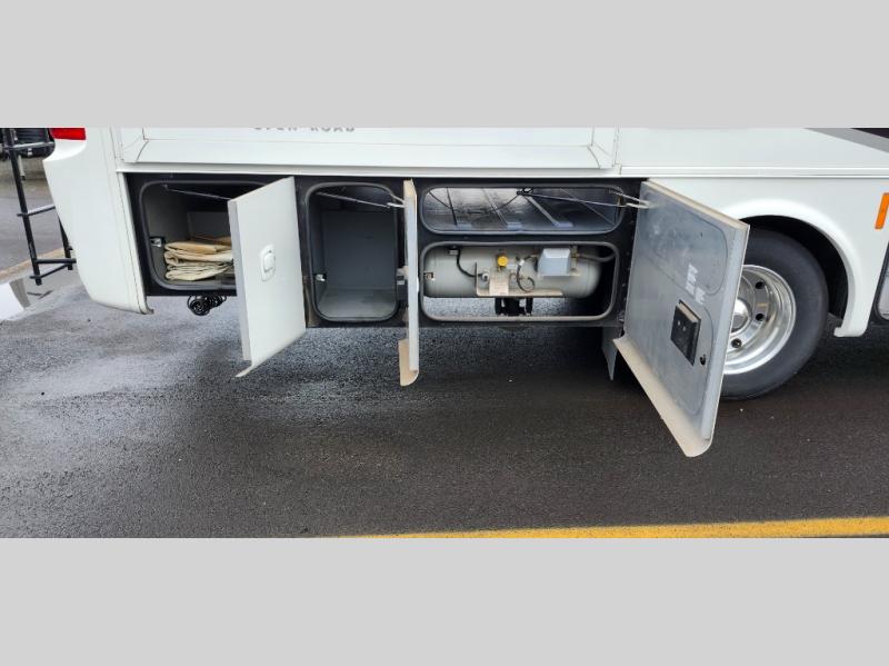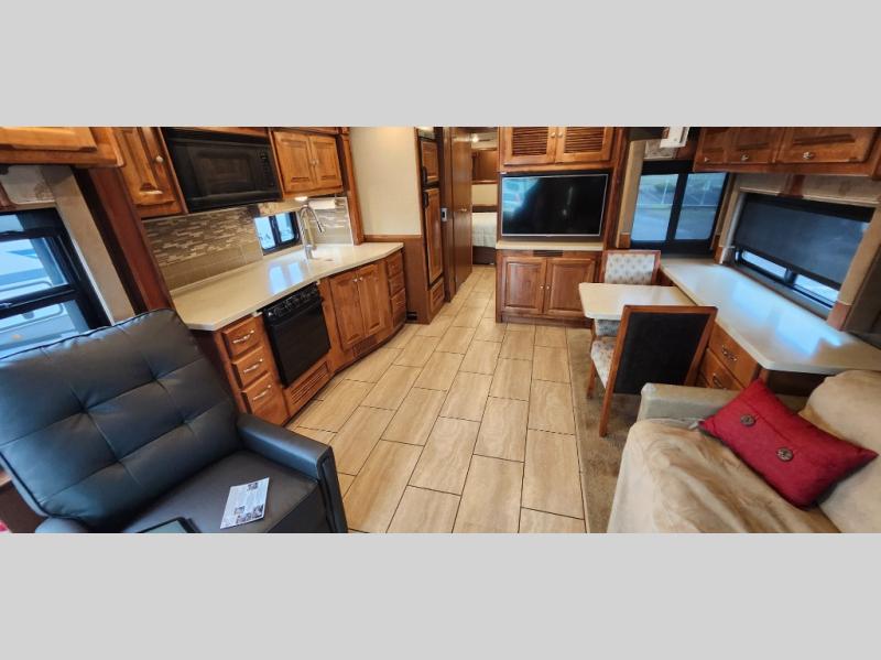A large slide out on the driver's side has a sofa bed, a booth dinette and overhead cabinets. A standard TV with a pantry below is on an inside wall and the TV faces the front of the coach. In place of the booth dinette, you may choose a dinette with computer workstation, plus more!