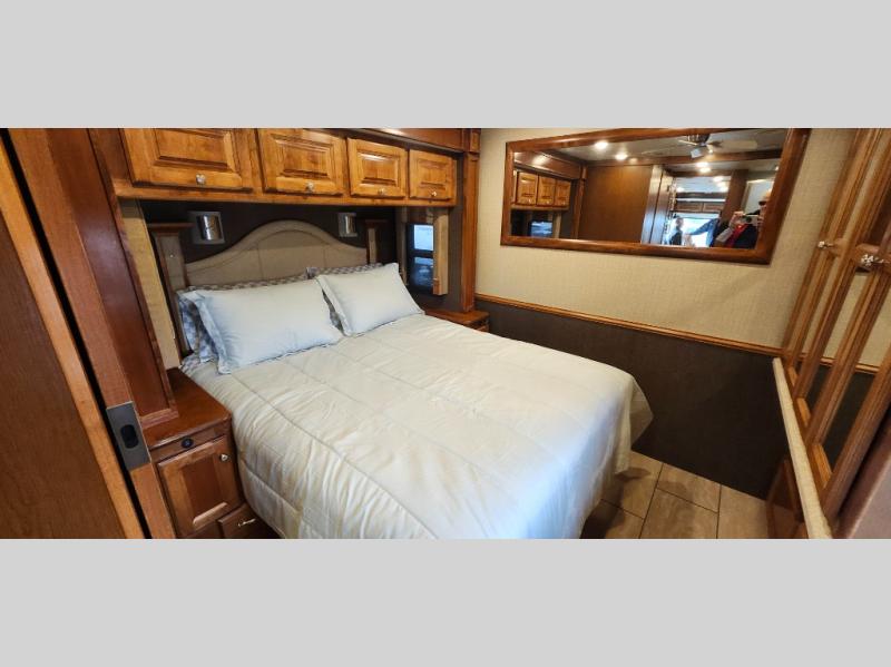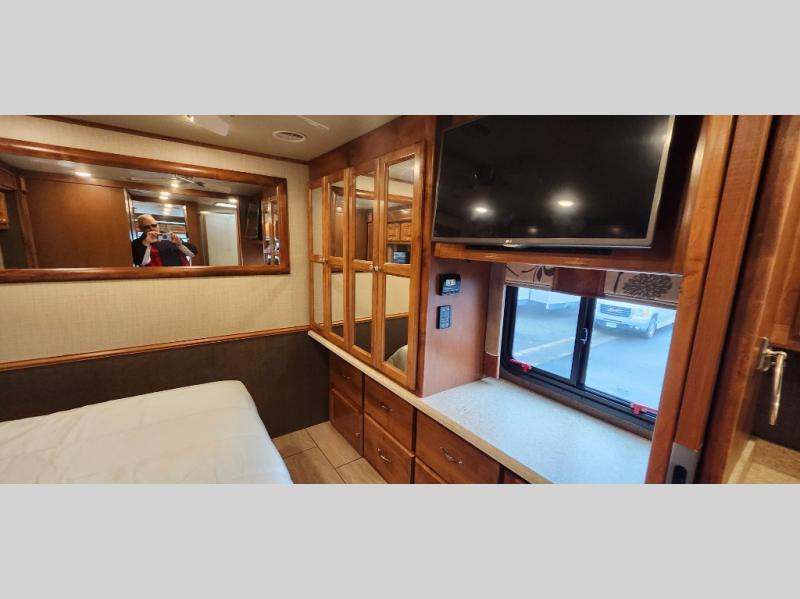 This class A motorhome includes a rear bedroom with a queen bed slide. There are nightstands an an overhead cabinet. A wardrobe with drawers below and a cabinet with a TV above are on the wall opposite the bed.