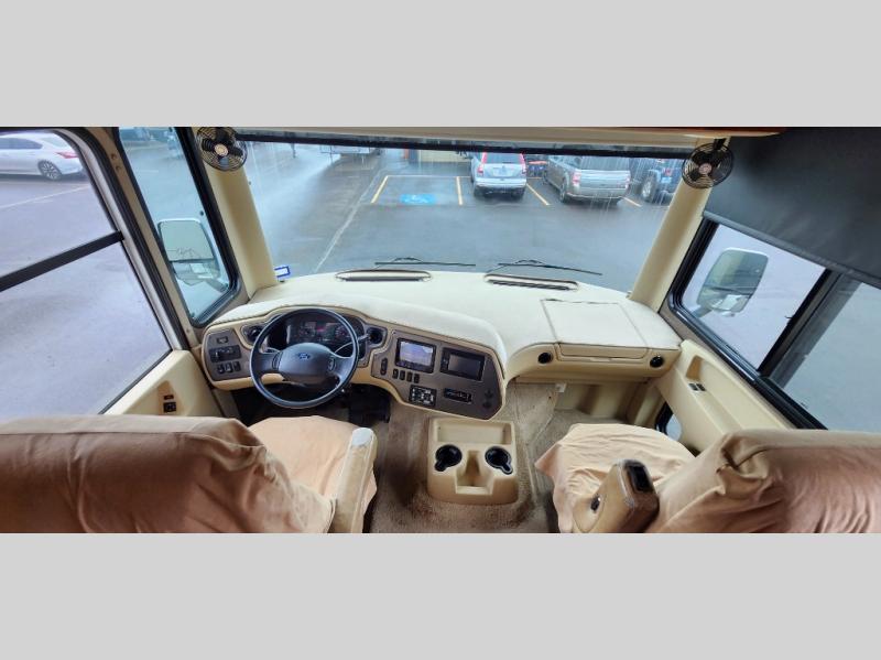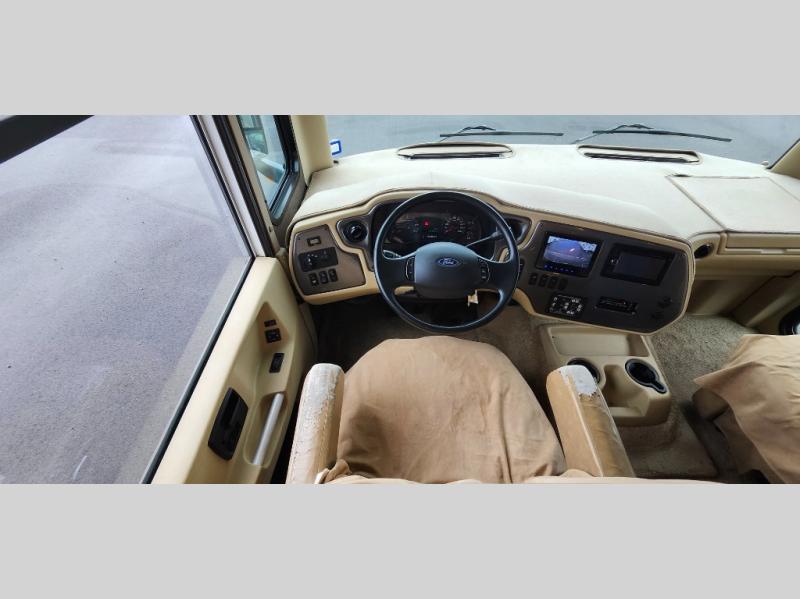 The cab area has two captain's chairs, overhead cabinets on each side, an optional center TV, and an optional driver side door.