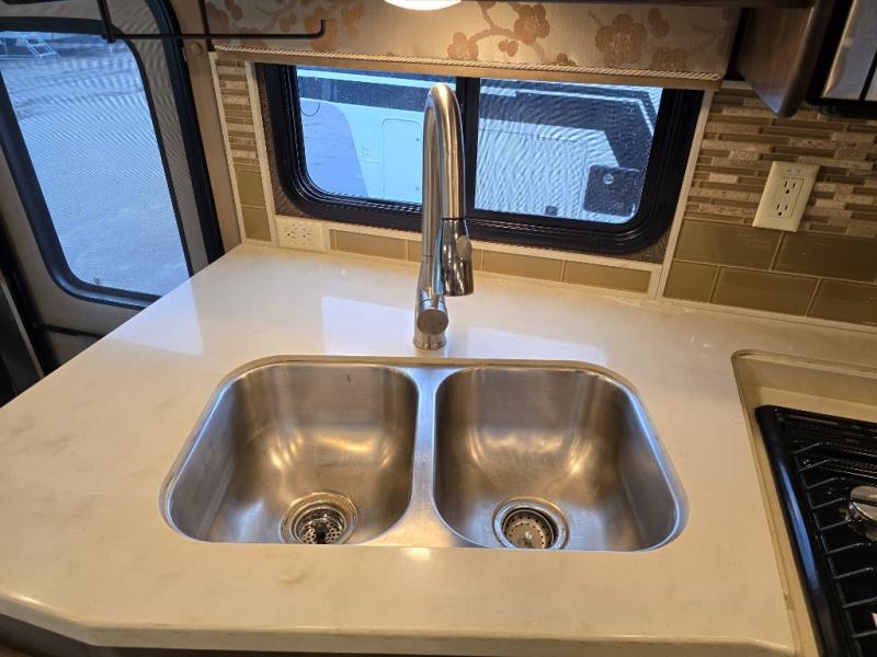 The road side offers a large slide which has a booth dinette, chaise sofa bed, lounge chair with an ottoman and overhead cabinets. You may choose an optional dinette with computer workstation or an optional l-shaped chaise sofa bed.
