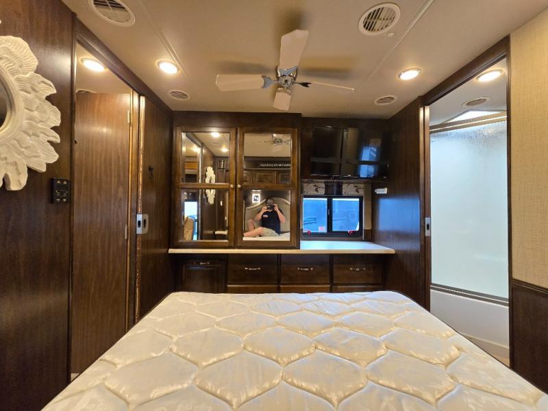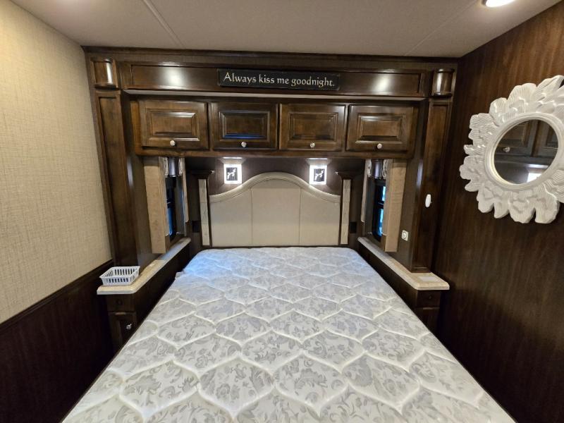 The private bedroom includes a queen bed slide with nightstands at each side and overhead cabinets. The wall opposite the bed includes a wardrobe with drawers below as well as a vanity with a TV and overhead cabinets above.